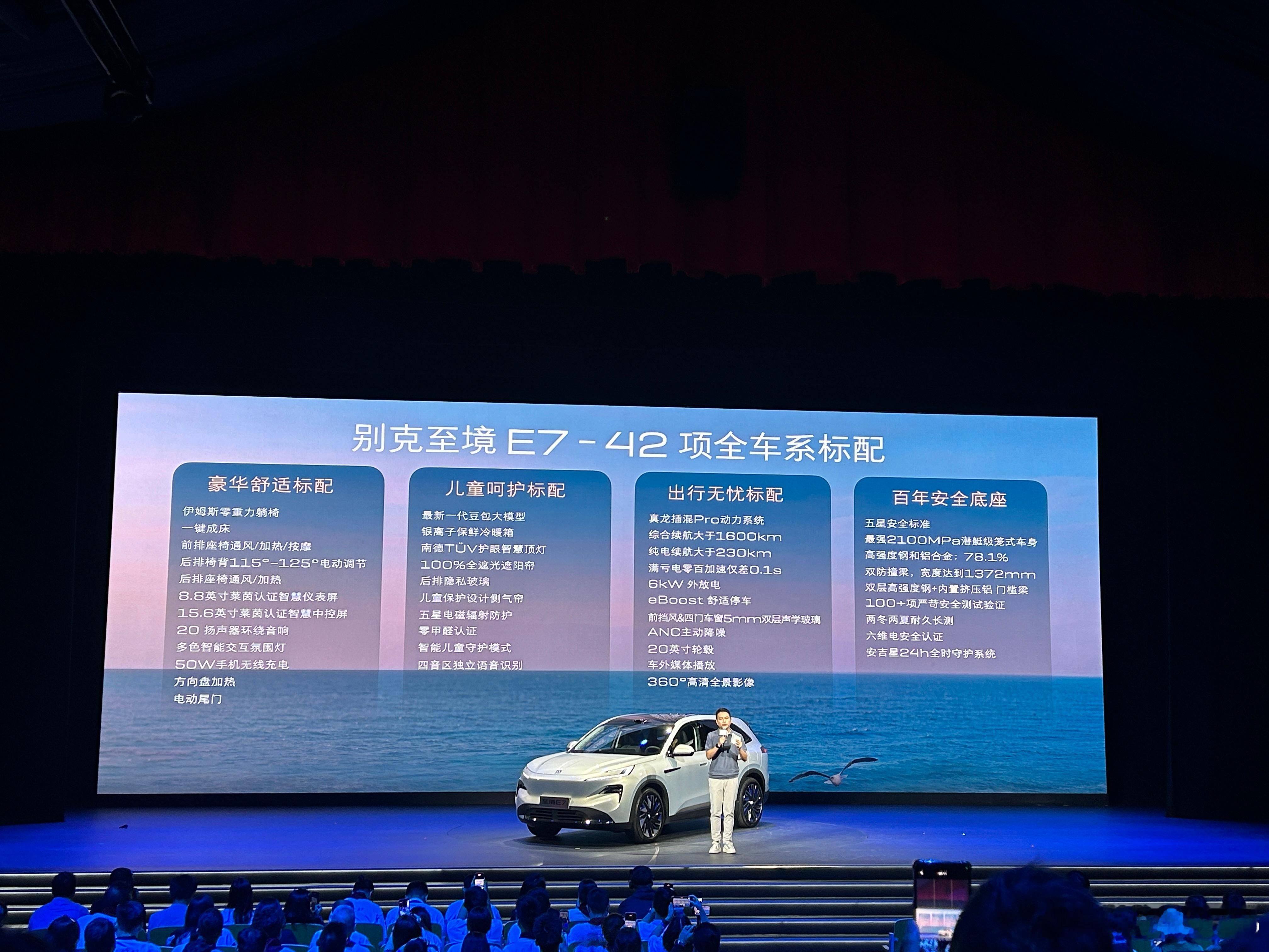 别克至境 E7 主要面向家庭用户,除了配齐“冰箱、彩电、大沙发”,在设计上着重考量了儿童的健康出行需求。座舱内主打恒温、恒湿、恒氧、恒洁、恒静的健康生态,车内空气质量达到了“零甲醛”,并采用母婴级标准材质,婴幼儿可以零距离接触或啃咬。新车搭载护眼顶灯,车内三个屏幕都通过了低蓝光护眼认证。此外,新车的安全气帘针对儿童的身高、坐姿进行了调整,可以为乘坐安全座椅的幼龄儿童提供更精准的防护。