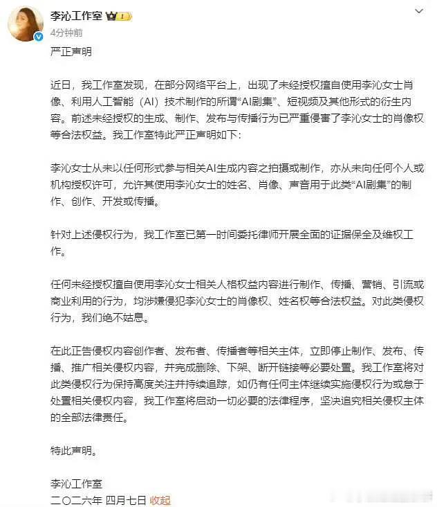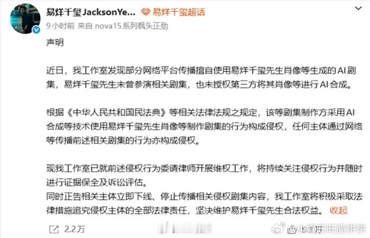 杨紫,易烊千玺,邓为,龚俊,李沁,沈月,檀健次,王鹤棣等明星都发文抵制AI了