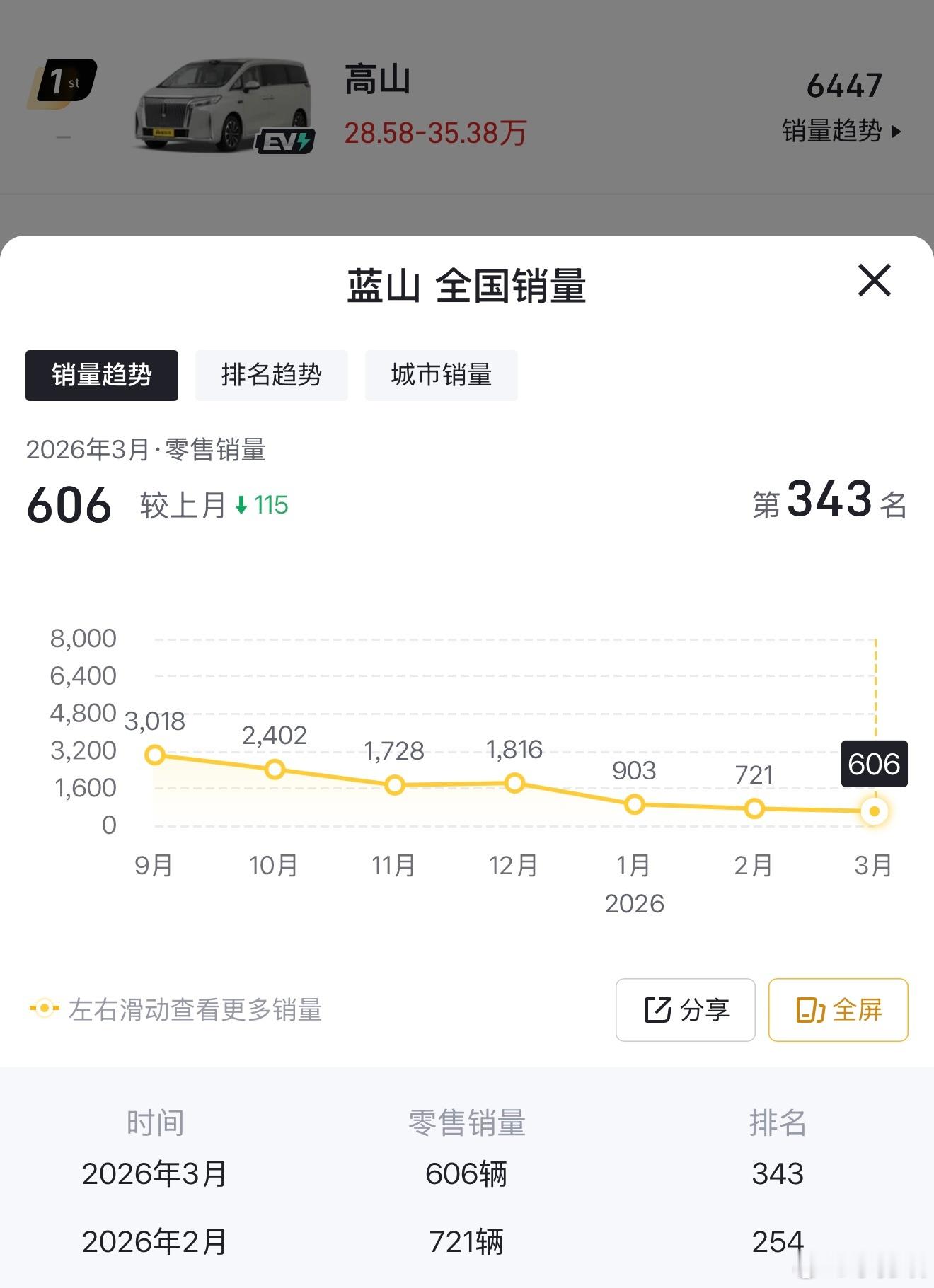 看了下魏牌蓝山的最新销量!已经连续几个月走低了,有人认为蓝山未来也许会降价保量,但是感觉停产的几率会更大一些,毕竟要给魏牌V9X让路!哎!长城现在哪个车能活的久点啊!除了坦克,感觉都是一地鸡毛,前几个月给点营销资源砸销量,热度一过立马萎,只能靠不断的出新款来维持,这也不是长久之计啊!VV系列、摩卡、拿铁、蓝山是这样,高山是正在这样,魏牌V9X将来大概率也会这样!!!魏牌V9X