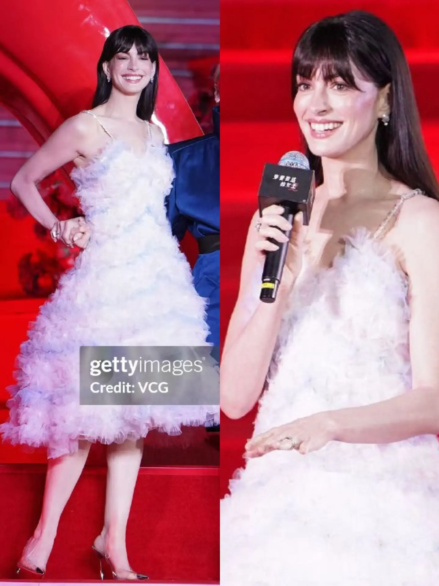 安妮身穿中国设计师方妍楠Susan Fang为其打造的轻盈仙女蓬蓬裙,配搭标志性的齐刘海披肩长发,脚踩水晶鞋,整身造型很出彩了,既仙美又“公主”