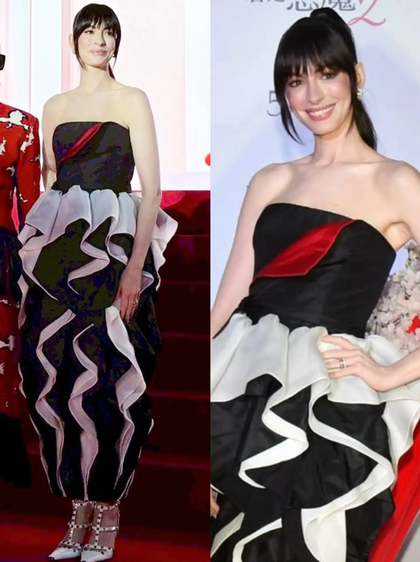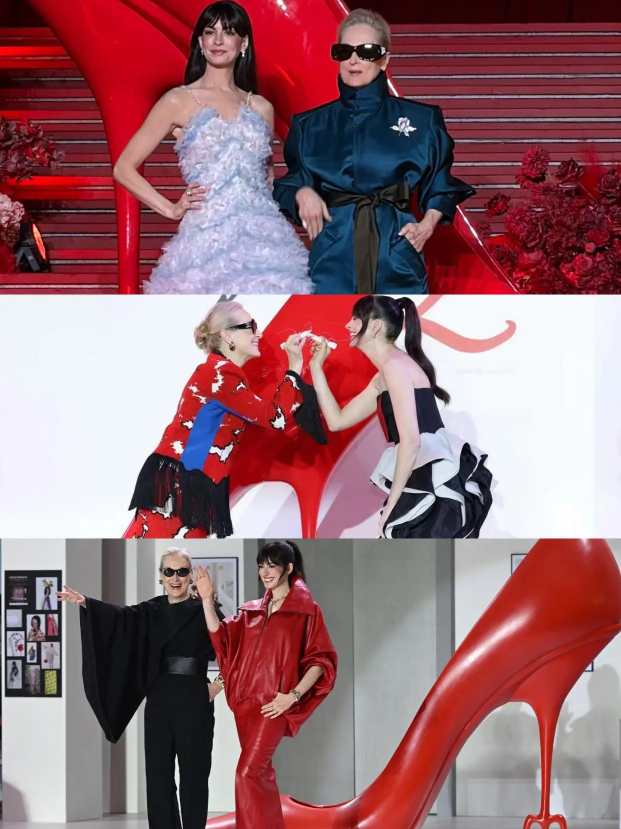 中日韩穿普拉达的女王2宣传穿搭。东京战:梅姨穿香奈儿手工坊套装,安妮·海瑟薇着Valentino高定,造型呼应日系夸张美学。