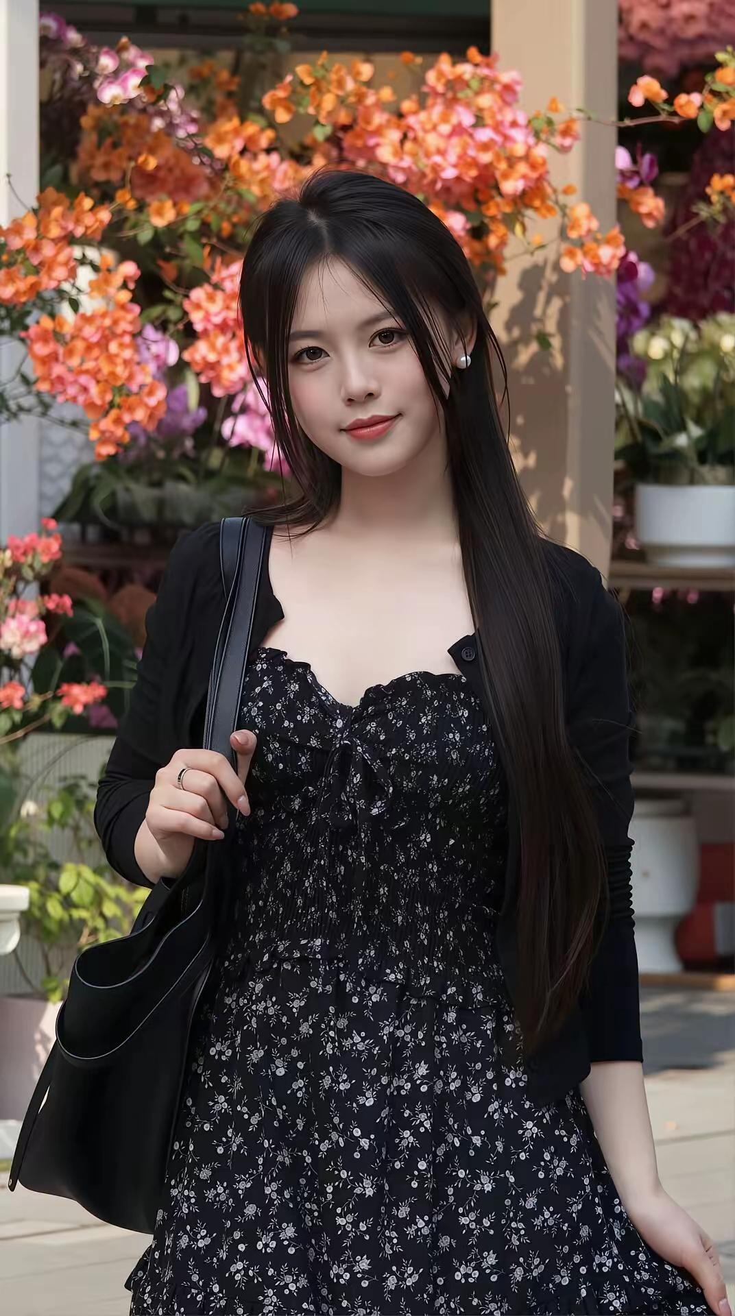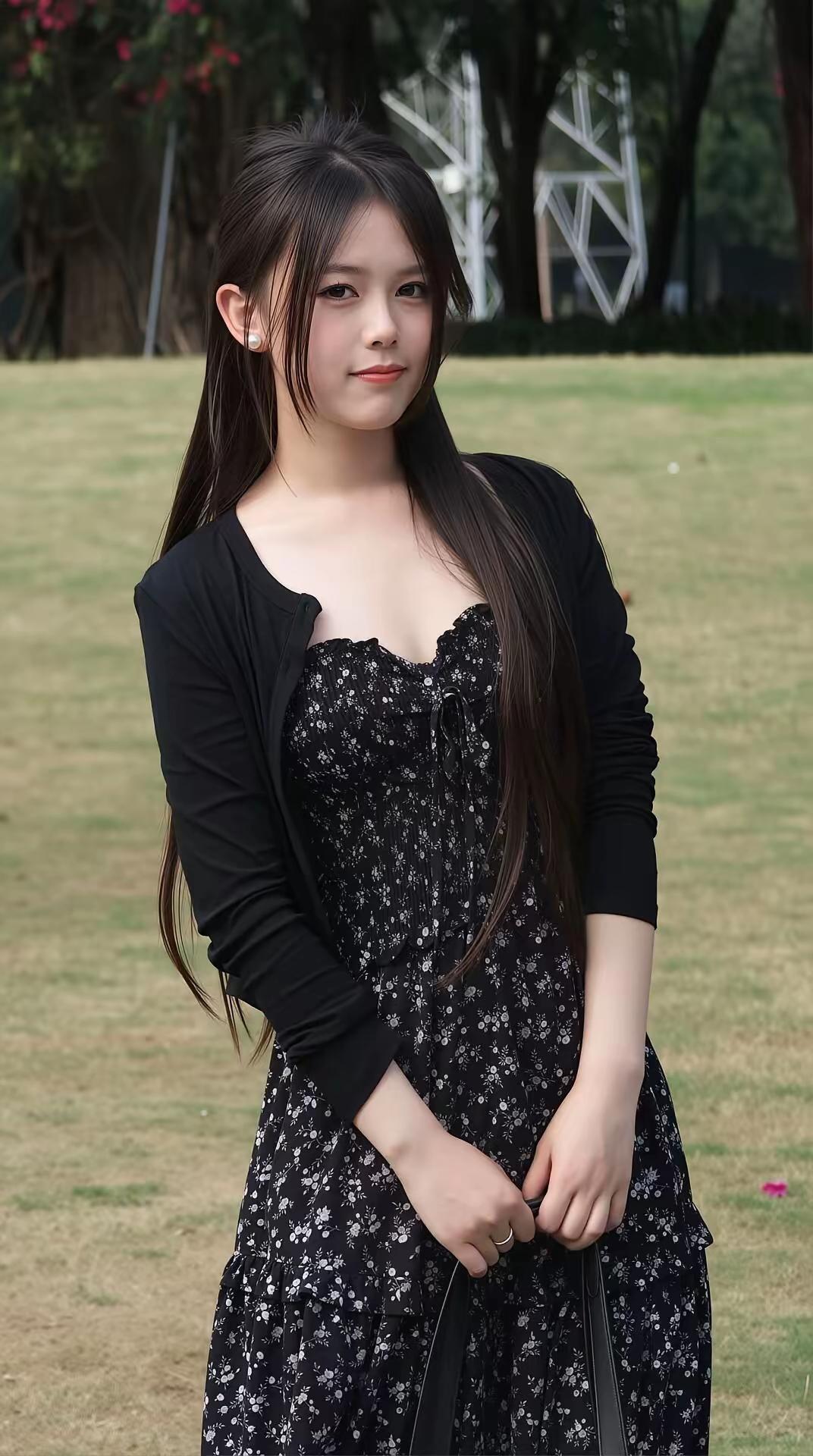 内搭是黑底白碎花木耳边吊带长裙,细碎小白花铺满裙身,温柔又显瘦,层叠蛋糕裙摆垂坠舒展,完美勾勒柔和身形;外搭一件软糯黑色修身长袖开衫,清冷低调又温柔百搭,极简黑调衬得气质干净又高级。
