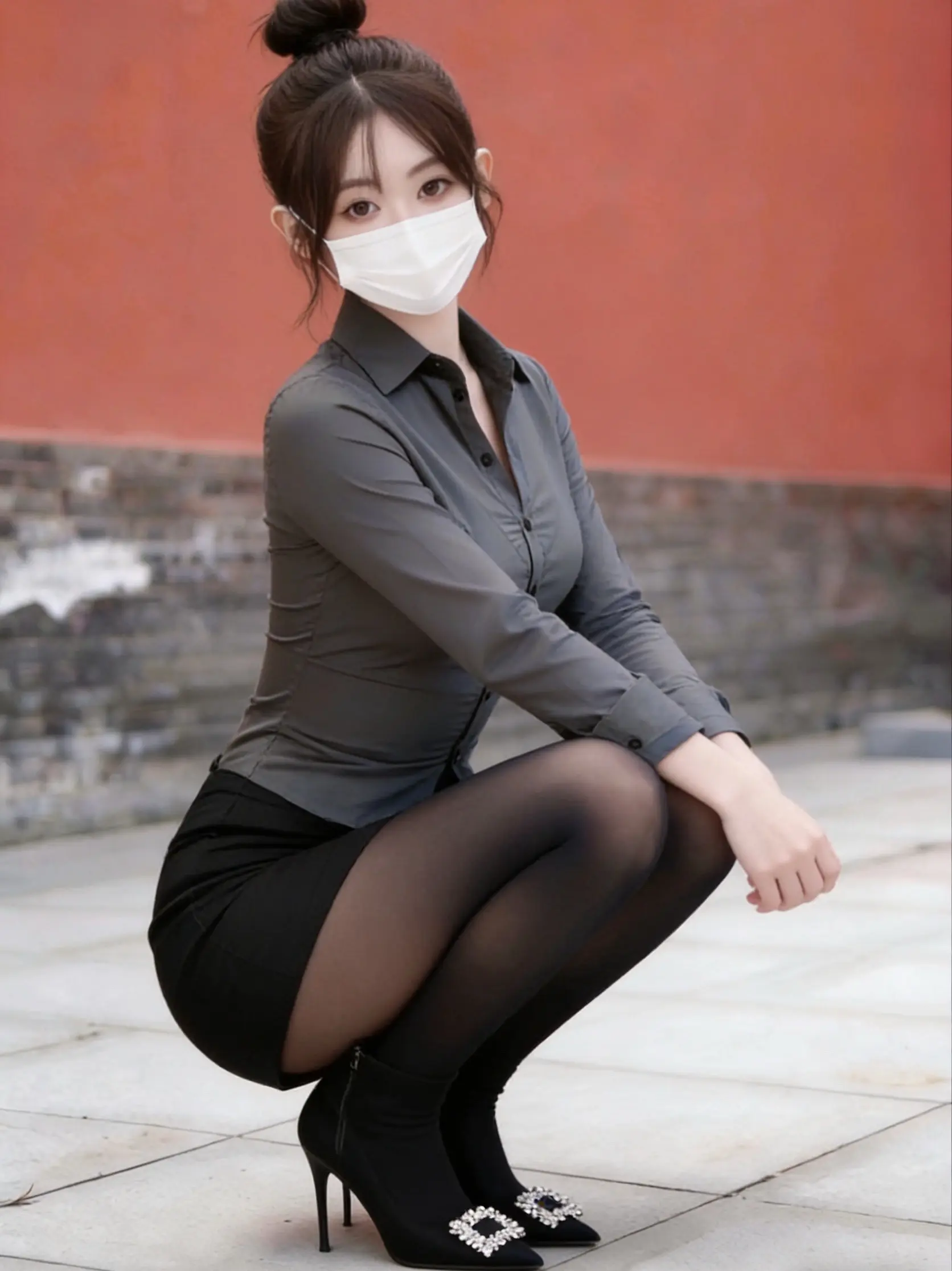 红墙下的通勤感,是温柔又利落的职场氛围感。灰衬衫+黑裙的经典搭配,在红...