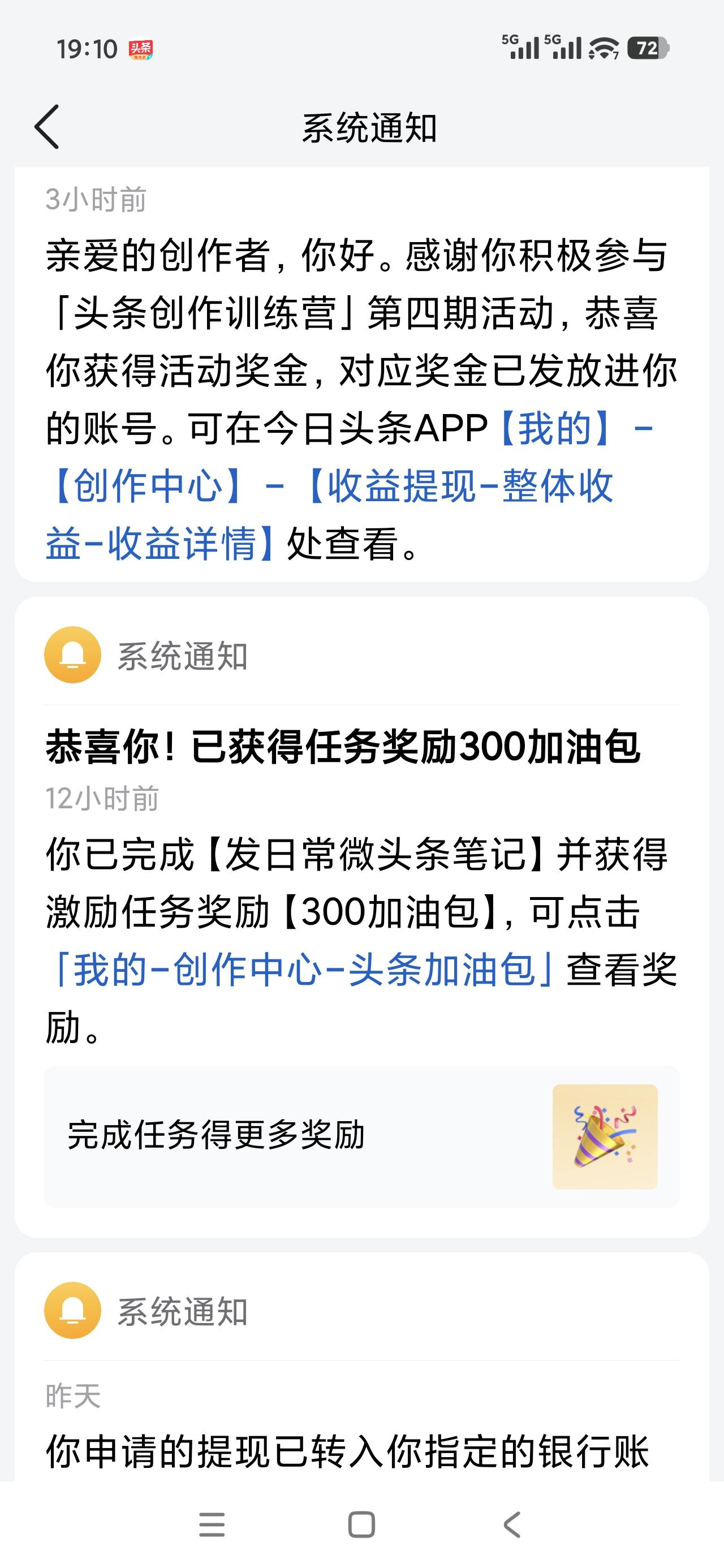 新年第一次为自己骄傲昨天收到了第四期“头条创作训练营”第三周的活动奖金十元,真有点惊喜,第一周收到了五元钱,第二周也是完成任务的,但却没有收到奖金,以为第三周也没有了,但却这么快收到了,十元钱是小事,但这是平台给我的肯定,心里还真有点为自己骄傲,因为也有人参加了没有得到奖励!继续努力加,加油!