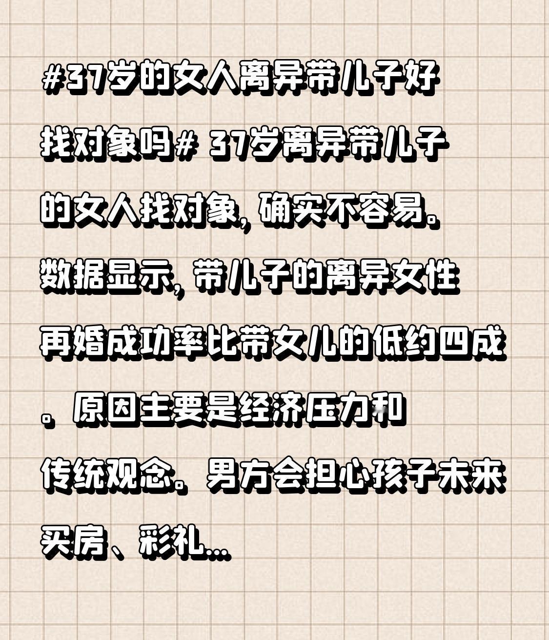 37岁离异带儿子的女人找对象,确实不容易。数据显示,带儿子的离异女性再婚成功率比带女儿的低约四成。原因主要是经济压力和传统观念。男方会担心孩子未来买房、彩礼等开销,还怕养别人孩子不划算、没回报。青春期男孩和继父易起冲突,也让关系尴尬。