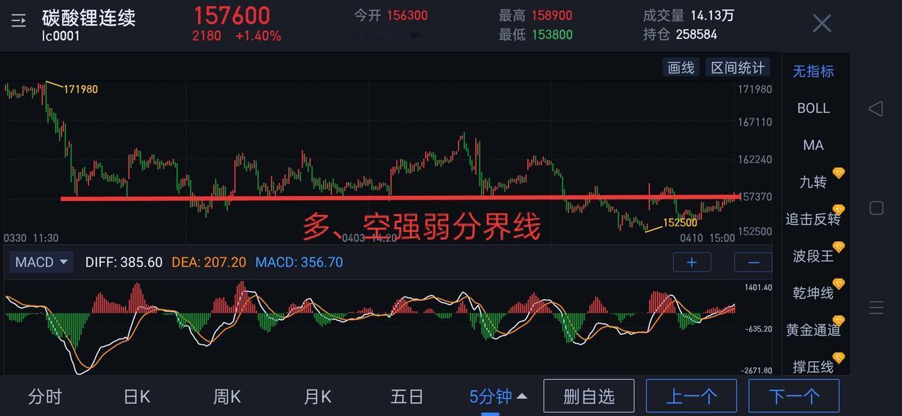 碳酸锂,多空博弈将进入深水区。 周五,碳酸锂并未形成图(1)中枢的三卖,目前走势仍是围绕该中枢的震荡延伸。在没围绕该中枢形成三买或三卖前,进场操作还需谨慎应对。 下周,碳酸锂走势仍可借助前期的多空分界线(图2)进行参考,观察该线能否有效站稳。站稳,暂保持多头思维,后期观察是否能有效突破165500的短期压力。若不能站稳,多头周五的反弹恐沦为昙花一现,空头将重夺主动权,图(3)黄色线段(日线一笔下)将继续延伸。 碳酸锂在此位置,操作上一定要破除我“执”。不做顽固的多头,也不做坚定的空头。要依时而定,依势而定,顺势而为。 下周,碳酸锂价格可*暂看*支撑位140040,压力位173000。