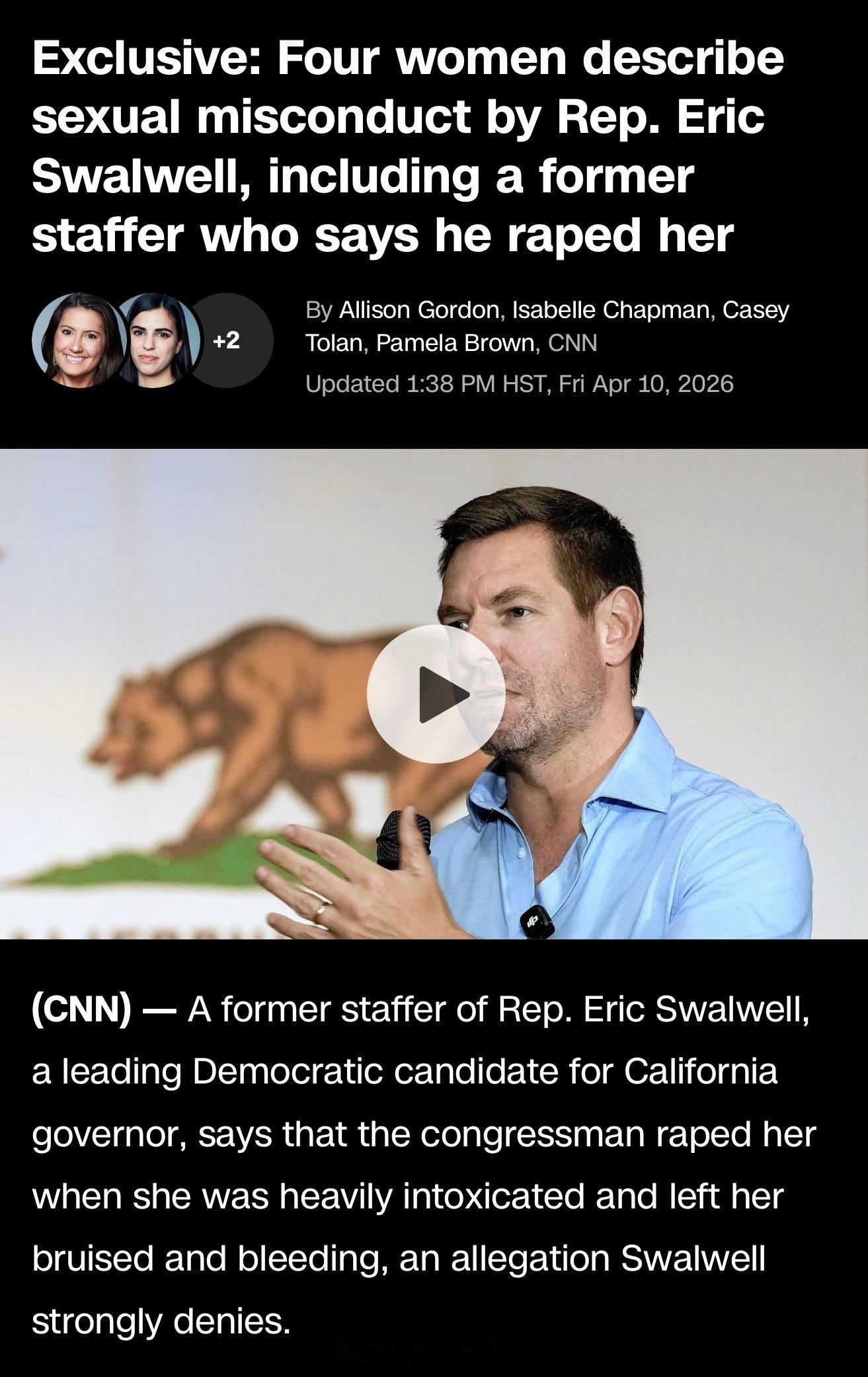 加州州长热门候选人、芳芳前男友Eric Swalwell继续被爆丑闻:今天报道Swalwell前女下属指控其两次性侵,一次是2019年她在 Swalwell 办公室工作时,另一次是2024年离职后一次慈善活后。