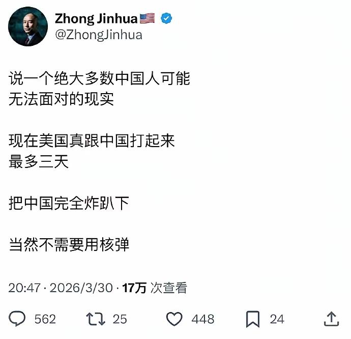 大殖子说:中美开战,中国最多三天就被炸趴下。