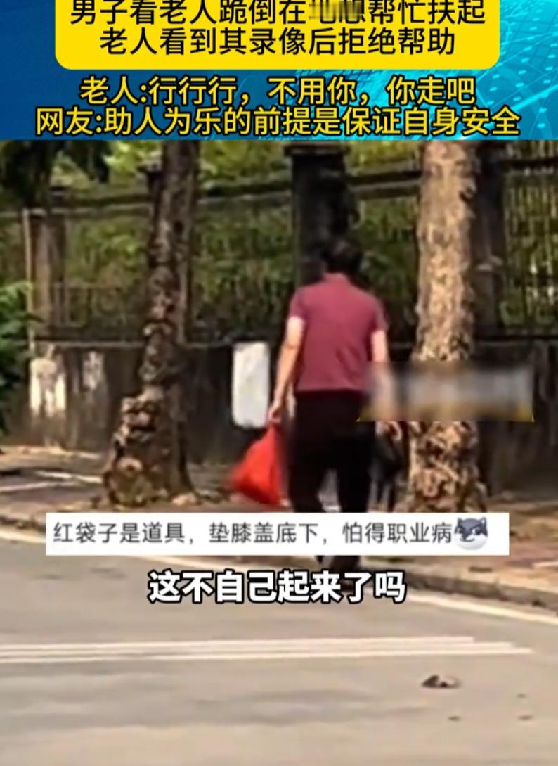 “还好我没扶她!”广西,一男子走在路上,突然发现前方一名老人跪倒在地,男子上前搀扶,又担心被讹,就打开手机录像,不料,老人一看男子在录像,立刻拒绝帮助,并赶他离开,事后男子发现对方自己站起来,也是有些后怕
