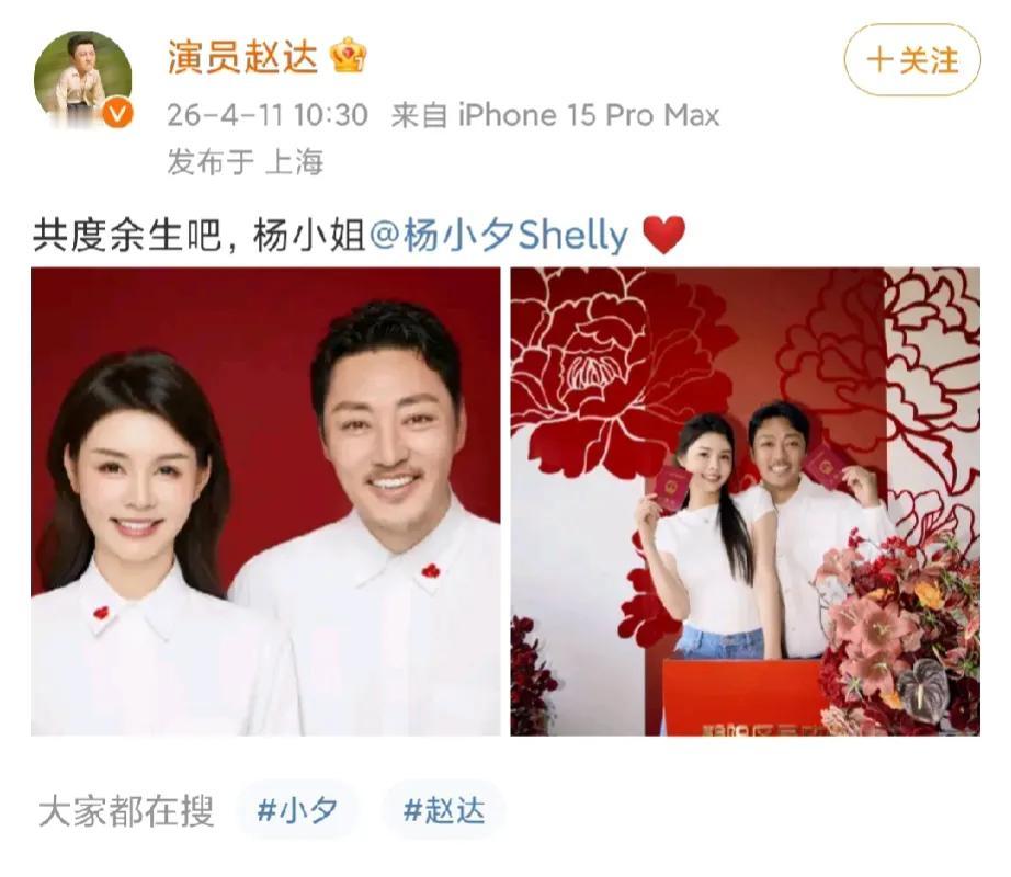 4月11日,45岁演员赵达突然在个人社交账号上官宣结婚,他写道,共度余生吧,杨小姐。简单一两句话,没有多余修饰之词,却满满都是甜蜜。