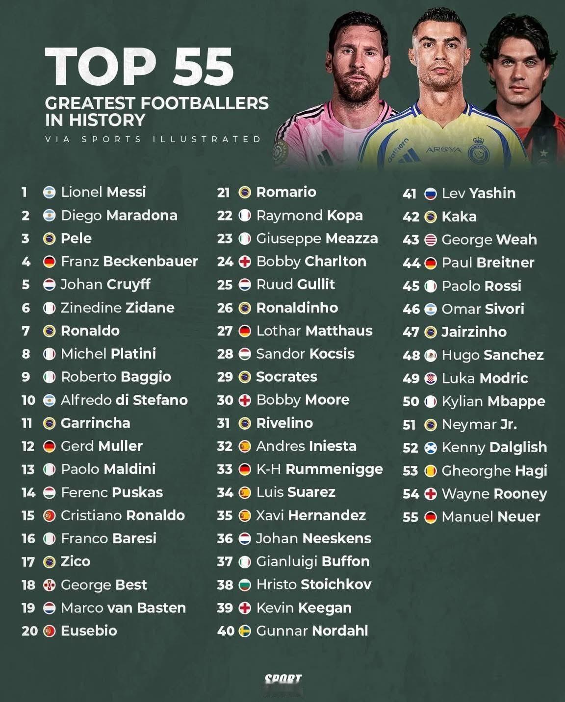 冇须有型 4 2026-04-11 18:54 我喜欢梅西排第一完全无问题,但c罗至少排第4吧 用户10xxx47 回复 04-11 20:20 你比专业的他们懂球 闲敲棋子落雪花 回复 04-11 19:09 你就这十年看球会这么说,再过十年,C罗可能二十名以外了。