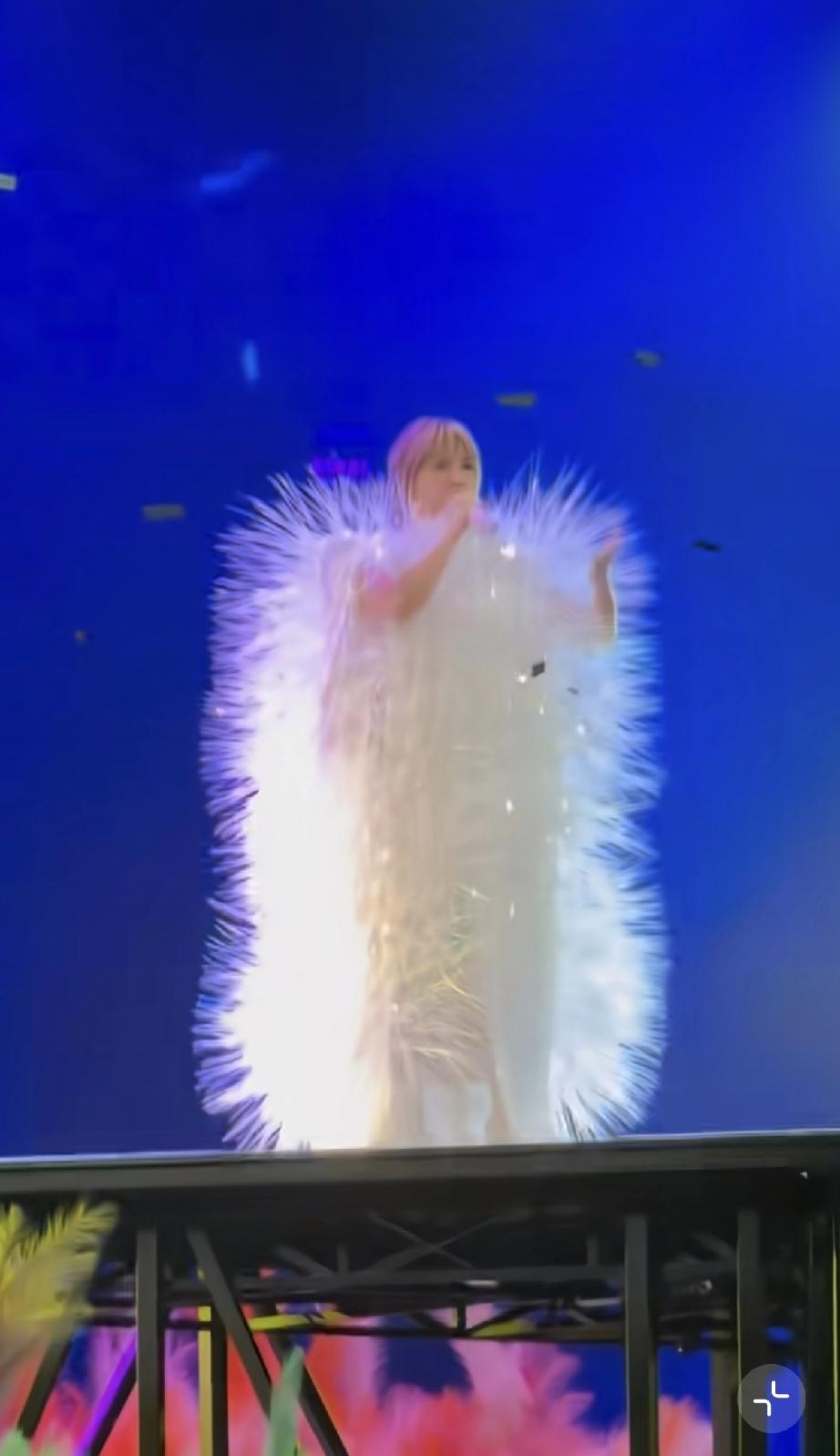 结果她在舞台上穿了海胆刺球裙子,远看就是一个胖胖的刺球,近看她闭着双眼伸出胳膊,确实挺胖,胳膊好粗,脸也胖了。