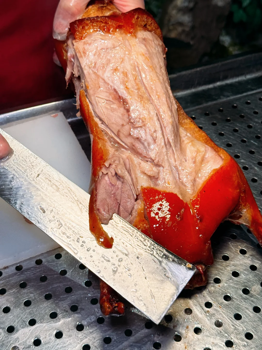 现烤现片的鸭子,皮烤得焦香酥脆,油光锃亮的
