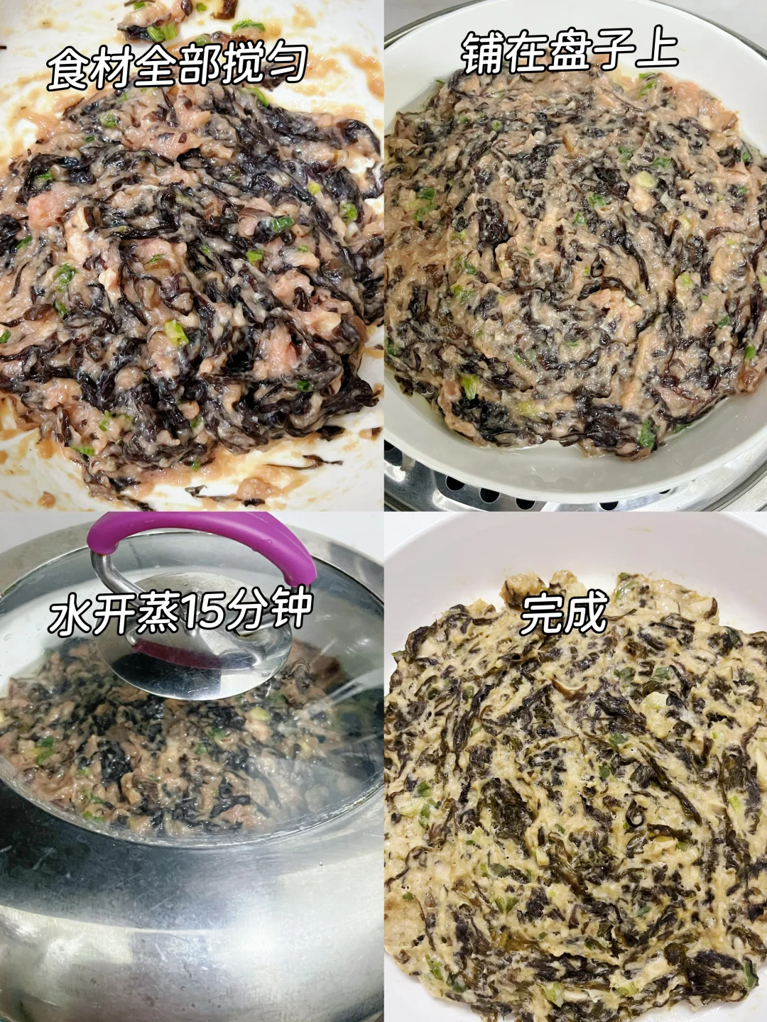 ① 肉选瘦点的,打泥更细腻;② 紫菜泡发后挤干水,不然馅会太湿;③ 蒸的时候盘子里刷层油,脱模超轻松~