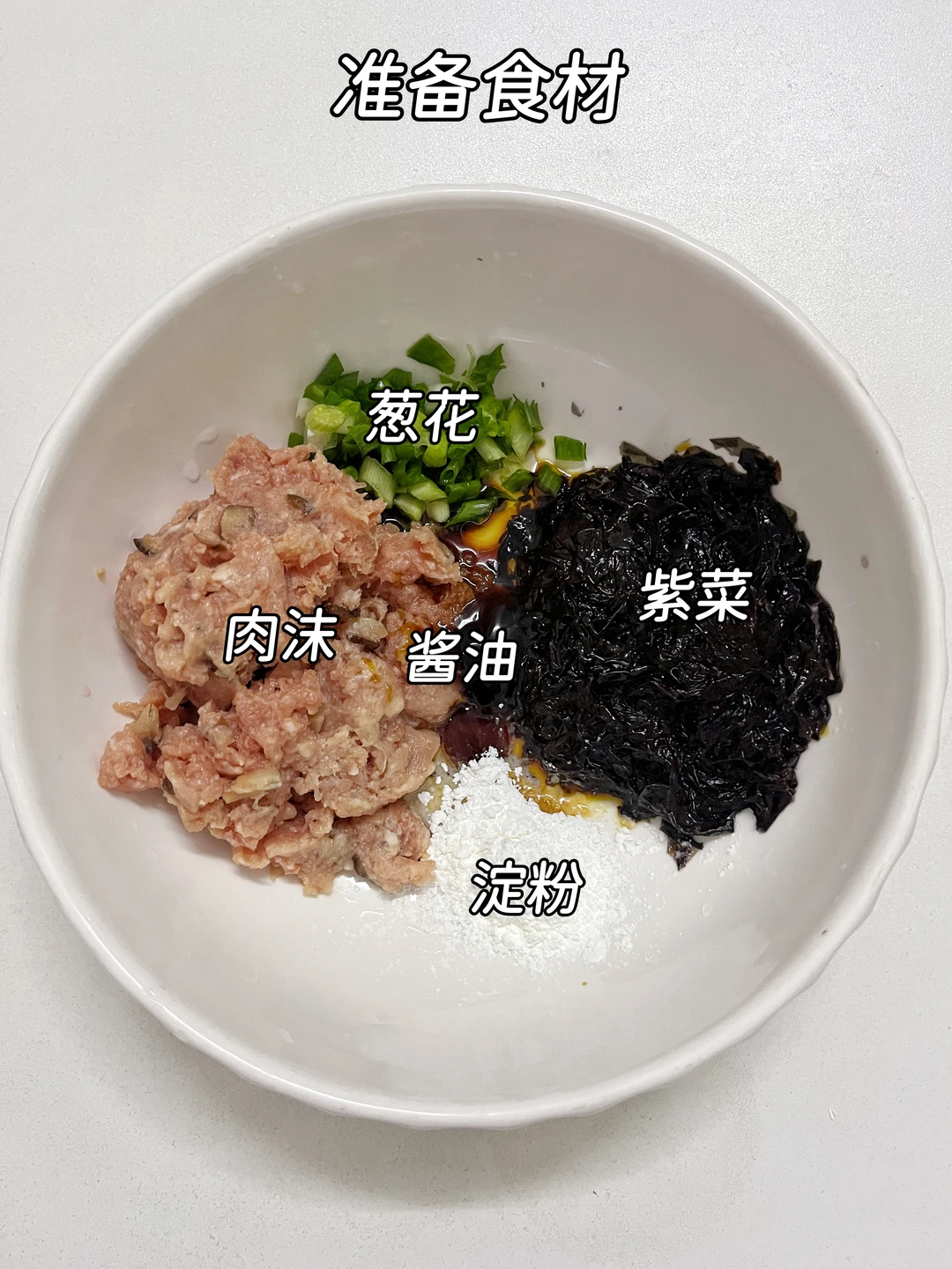瘦肉200g、紫菜半块(泡发)、葱花适量、酱油1勺、淀粉2勺、香菇粒适量(泡发切碎)、鸡蛋1个