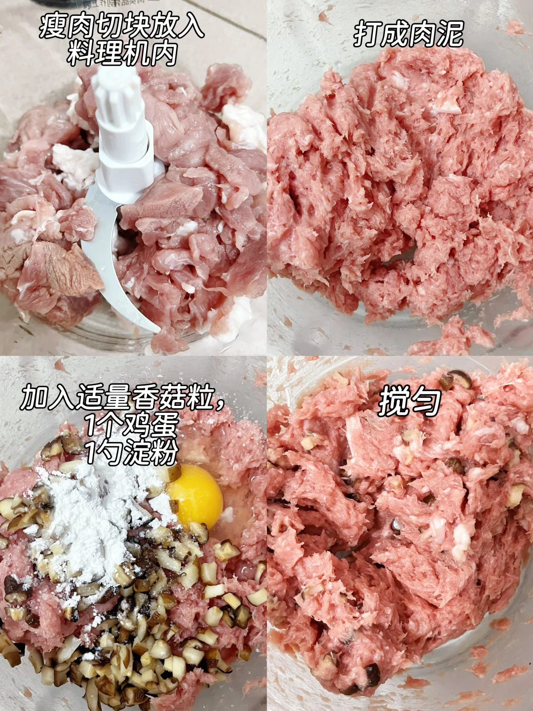 1. 打肉泥:瘦肉切块丢料理机,打成细腻肉泥;