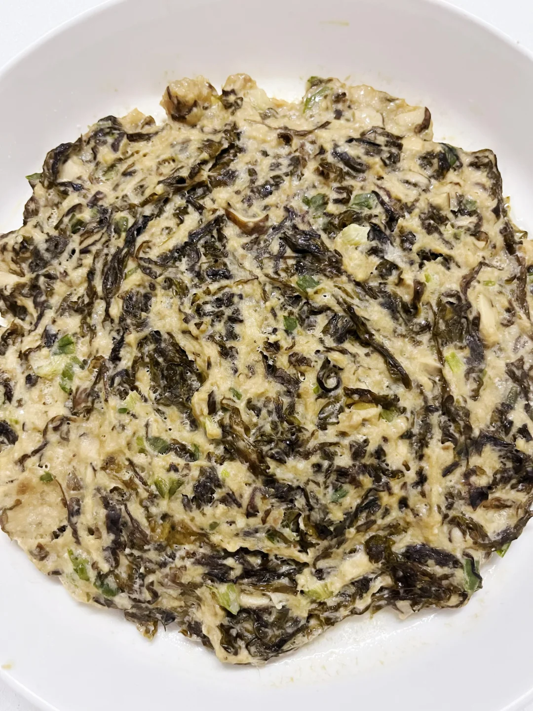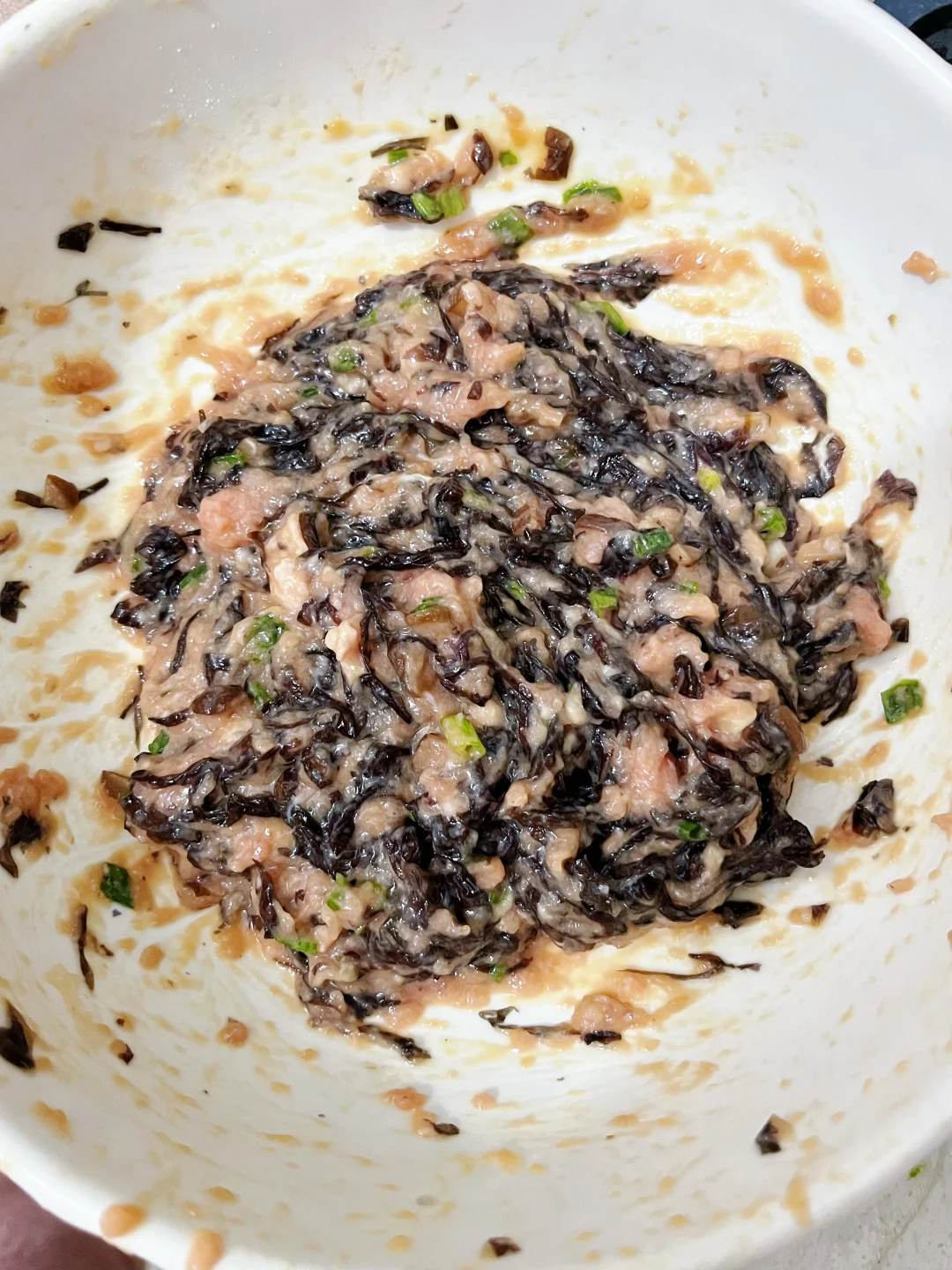 2. 调馅:肉泥里加香菇粒、鸡蛋、1勺淀粉,搅匀(肉更嫩!);再扔紫菜、葱花、1勺酱油,继续搅到黏糊糊;