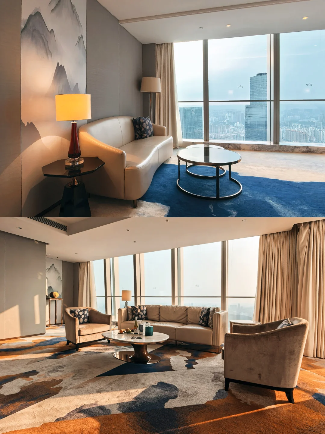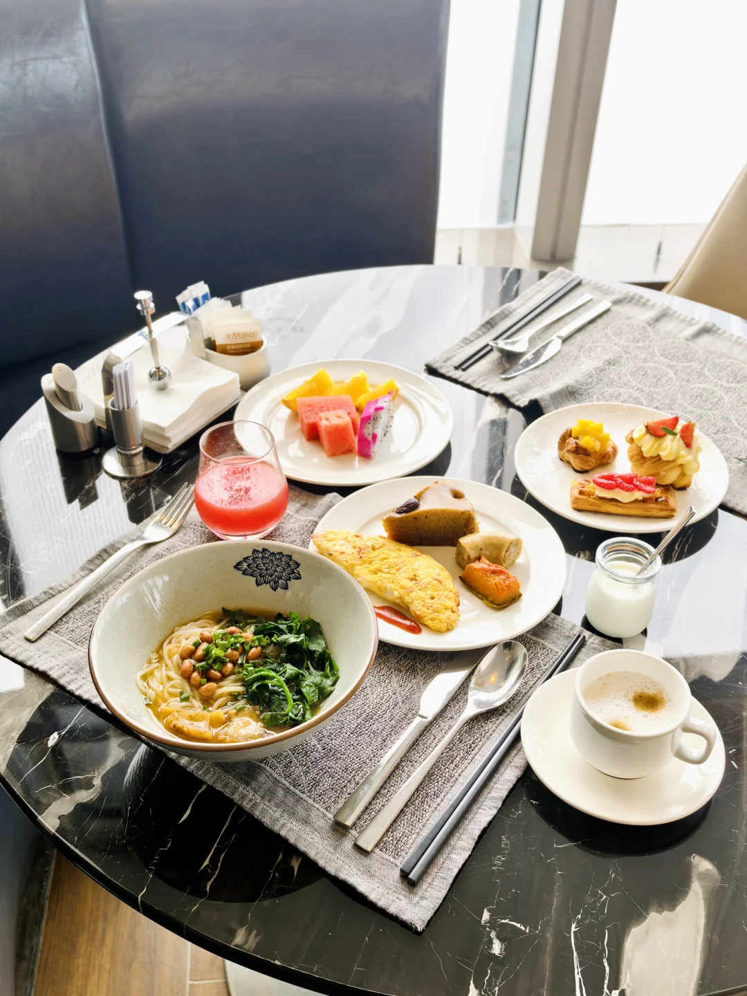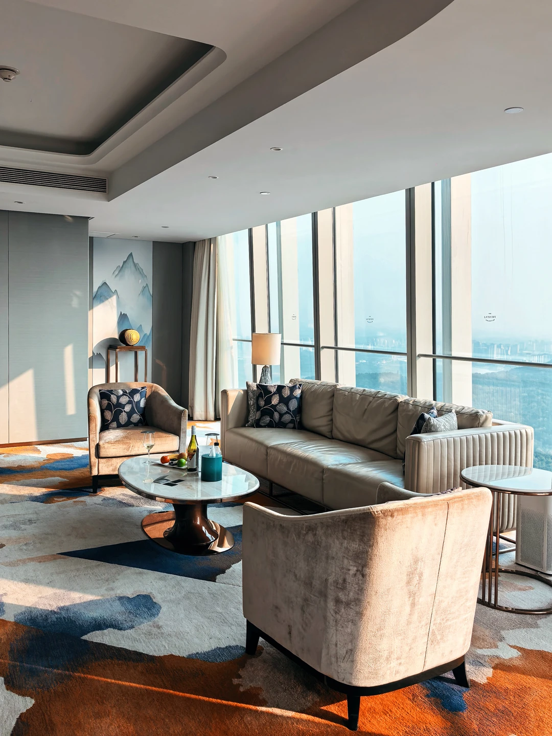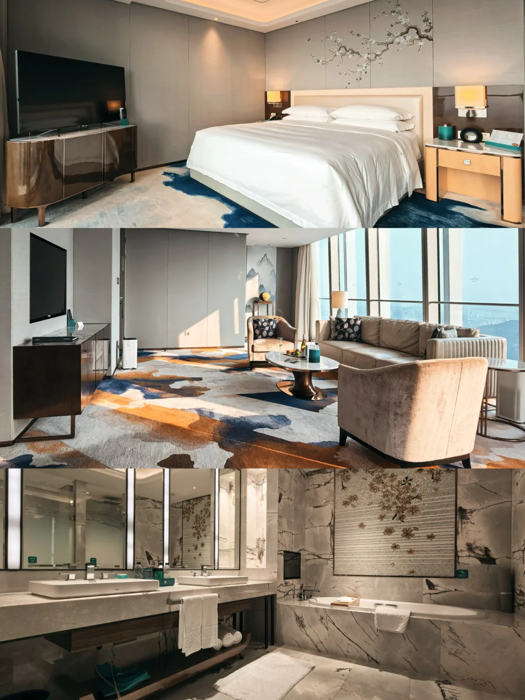 980下订含2000积分,钛金卡给了45层天际线景观高级套房。在100平+270度落地窗的房间一览南宁市的风光。从日出到黄昏,除上海/深圳外,这种云端视角在酒店界也是少见的。隔天上午续住一晚,好的酒店可以多停留一下。