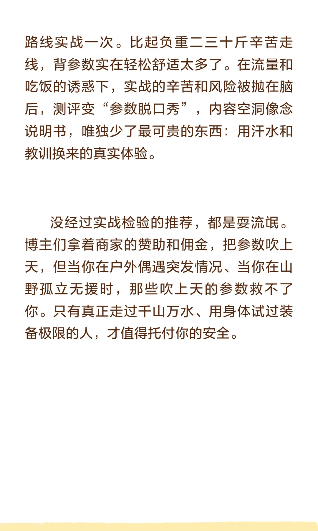 没经过实战检验的推荐,都是耍流氓。 博主们拿着商家的赞助和佣金,把参数吹上天,但当你在户外偶遇突发情况、当你在山野孤立无援时,那些吹上天的参数救不了你。只有真正走过千山万水、用身体试过装备极限的人,才值得托付你的安全。
