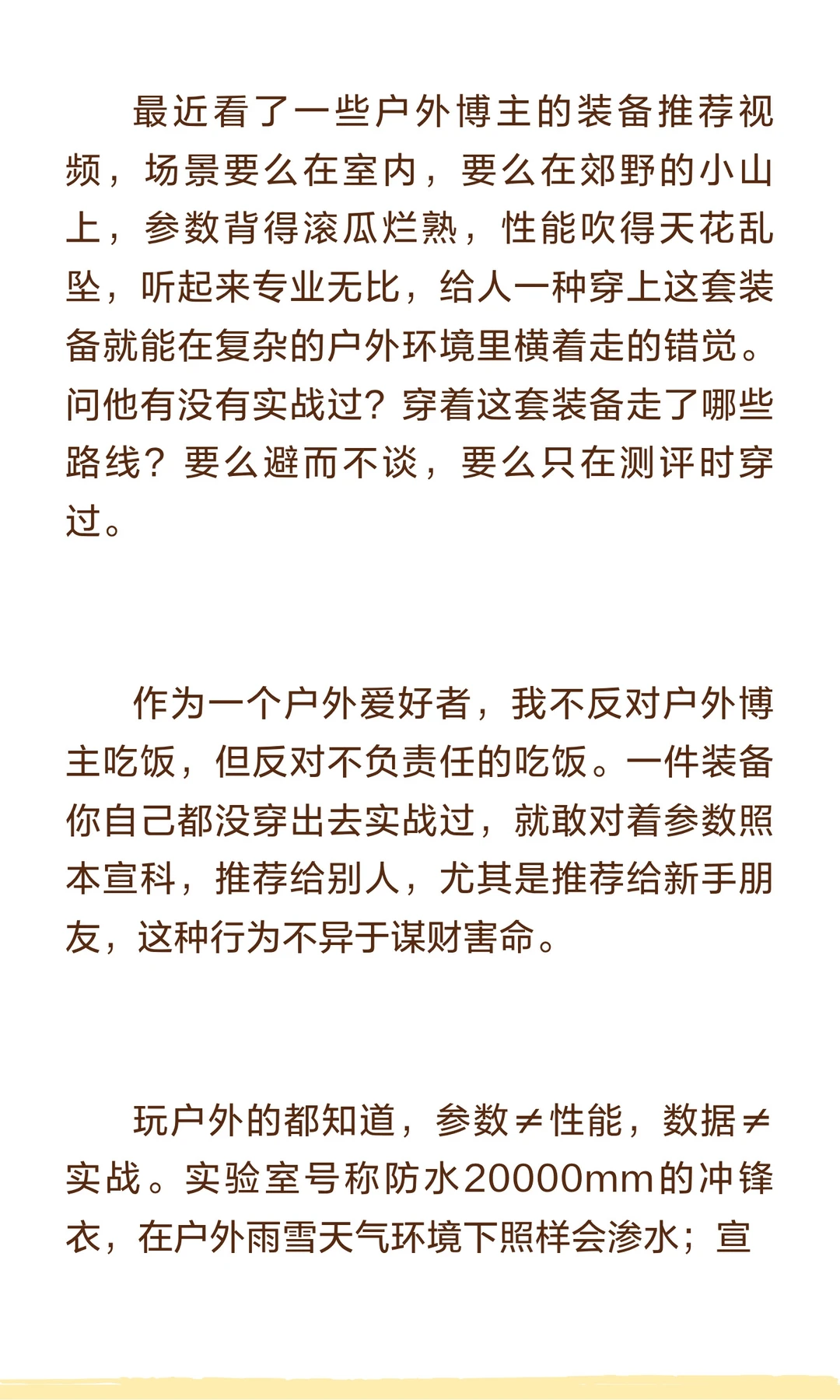 作为一个户外爱好者,我不反对户外博主吃饭,但反对不负责任的吃饭。一件装备你自己都没穿出去实战过,就敢对着参数照本宣科,推荐给别人,尤其是推荐给新手朋友,这种行为不异于谋财害命。