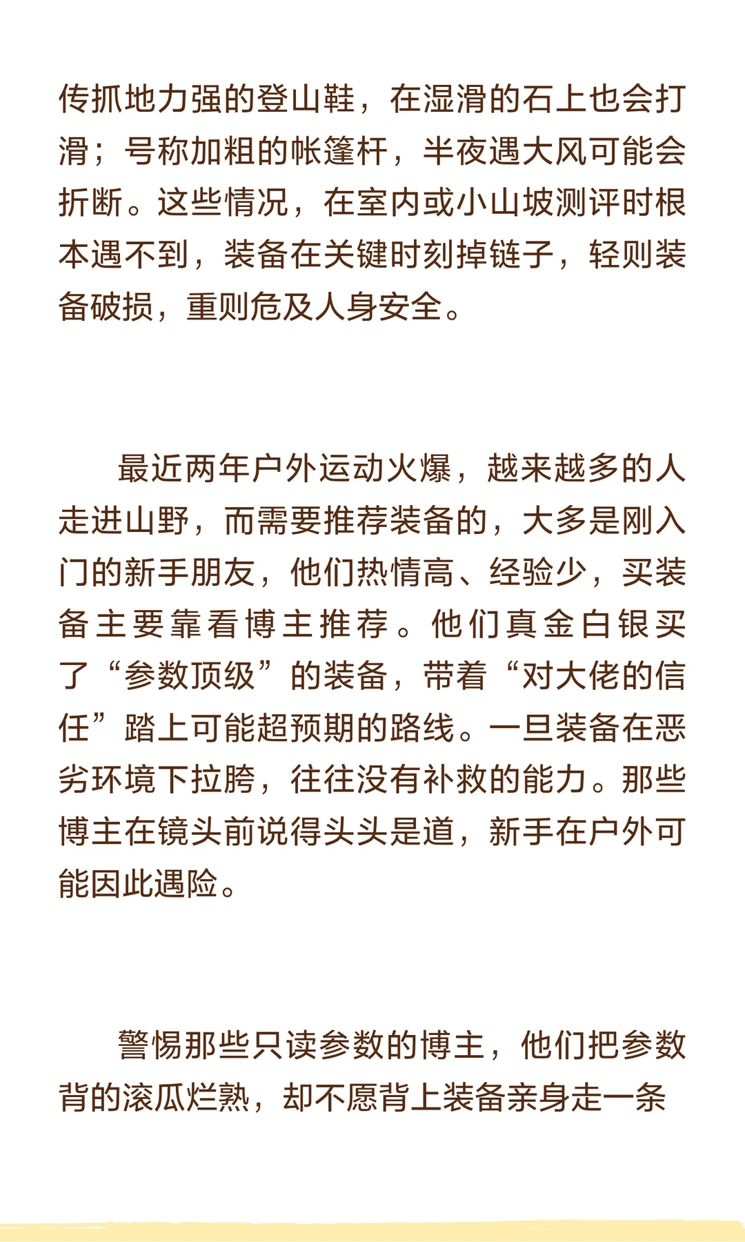 最近两年户外运动火爆,越来越多的人走进山野,而需要推荐装备的,大多是刚入门的新手朋友,他们热情高、经验少,买装备主要靠看博主推荐。他们真金白银买了“参数顶级”的装备,带着“对大佬的信任”踏上可能超预期的路线。一旦装备在恶劣环境下拉胯,往往没有补救的能力。那些博主在镜头前说得头头是道,新手在户外可能因此遇险。