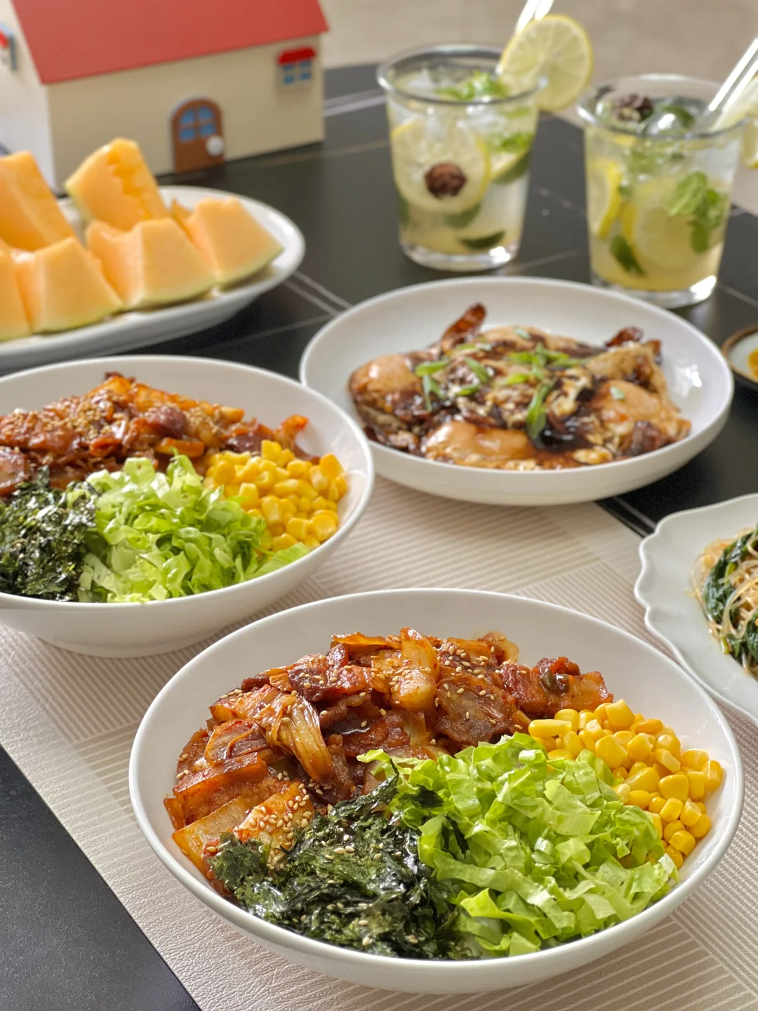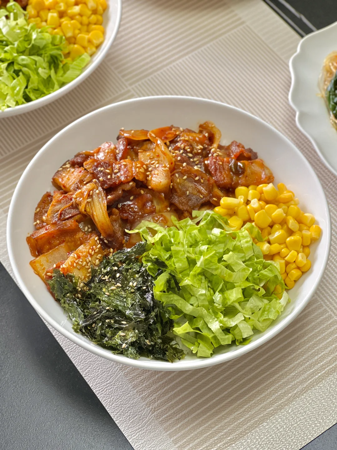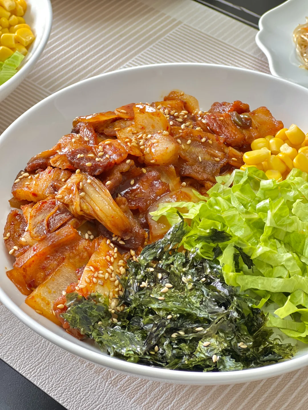 今天标题里的“食光”是指我把这一大碗拌饭都吃光了的意思[暗中观察R][暗中观察R]焦香的五花肉裹满韩辣酱,配上爽口的生菜、甜玉米和海苔碎,搅拌的时候就被香迷糊了!