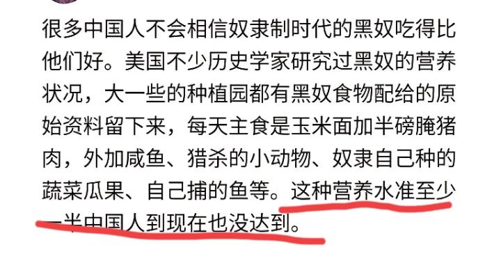还有小公知说,美国19世纪之前的黑奴,吃的也比大部分中国人好,因为黑奴们每天都能吃到大量的肉类,这种营养水准,今天一半中国人也没达到,