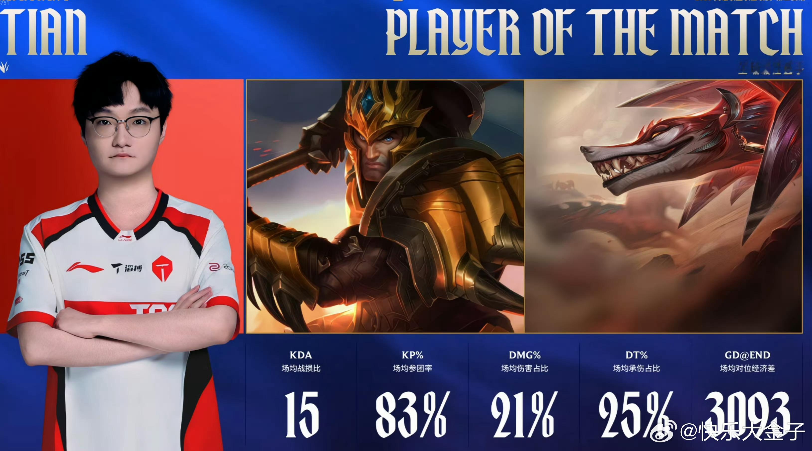 tian四杀超神 Tian 10-0-3的四杀纳亚菲利拿下MVP,同时也收获POM。jackeylove输出爆炸TES战胜JDGTOP_ESPORTS