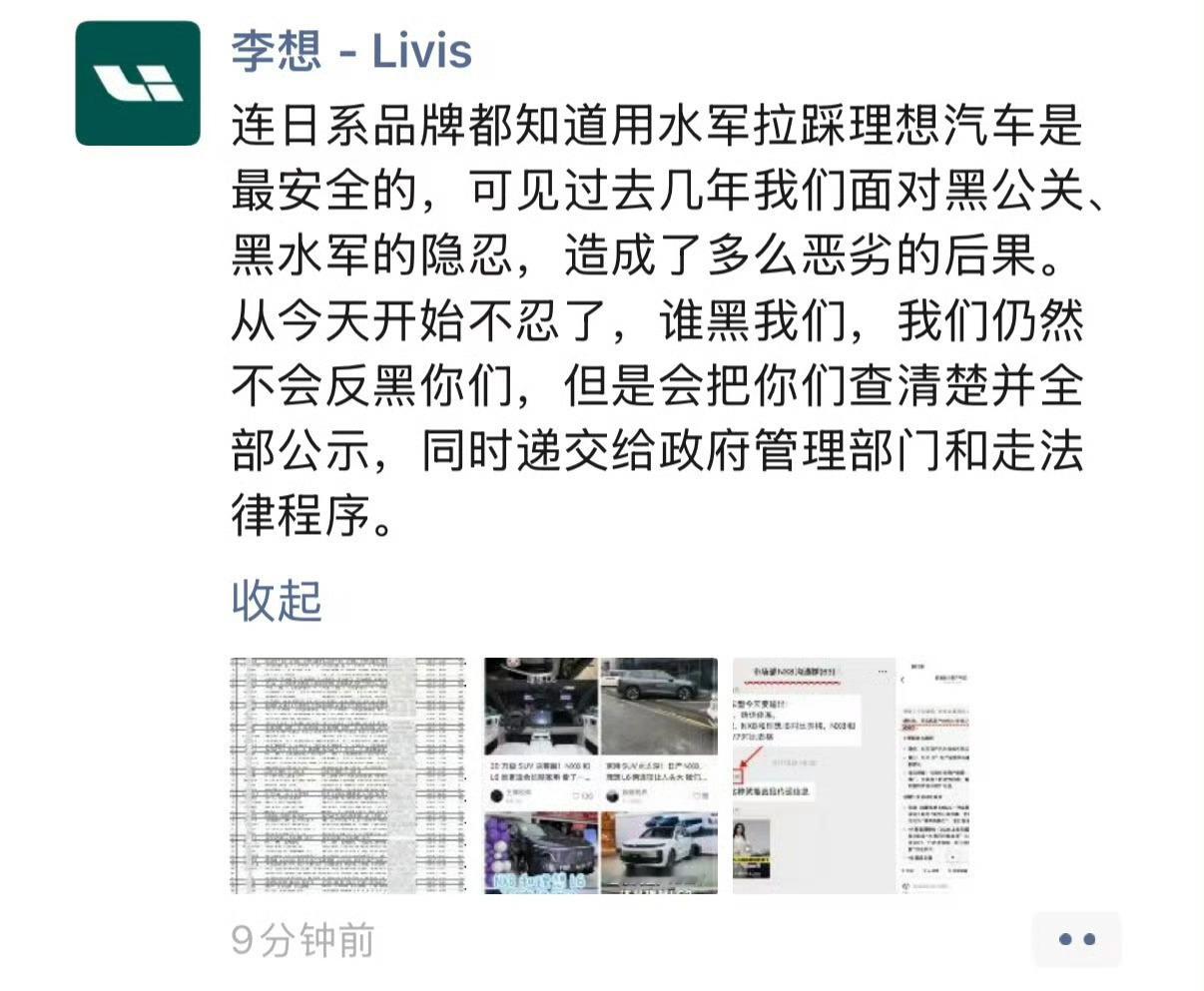 李想又发了一条朋友圈,这次不忍了,准备干到底理想法务部也正式声明,取证并报案