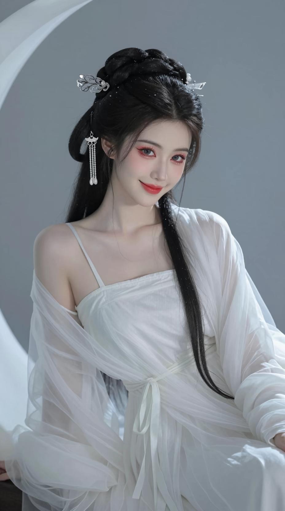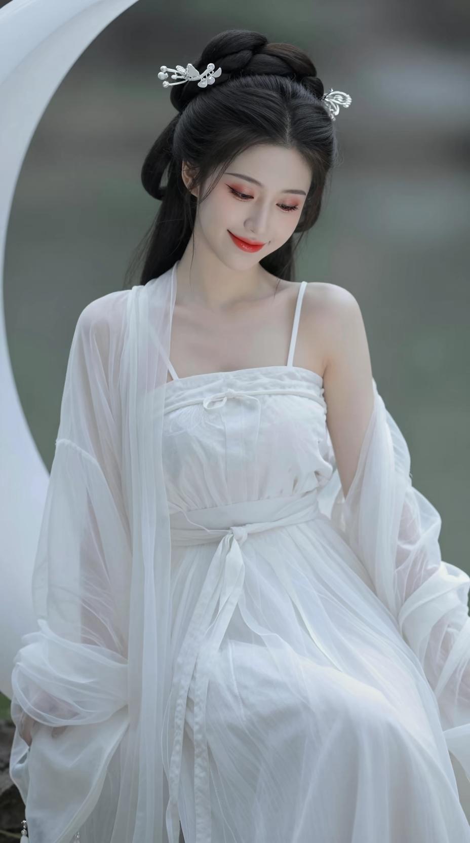 服饰:轻薄通透的纱质外衫,搭配简约的白色吊带内搭,朦胧中露出优美的肩颈线条,既保留了古韵的飘逸,又兼具现代的性感与灵动。