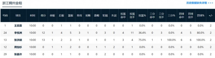 浙江:张洪硕13分3篮板1助攻1盖帽,李悦洲12分5篮板3助攻1抢断。