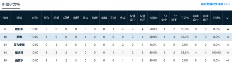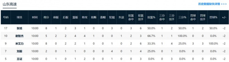 山东:米艾力8分2篮板1助攻,张旭8分3篮板1助攻。