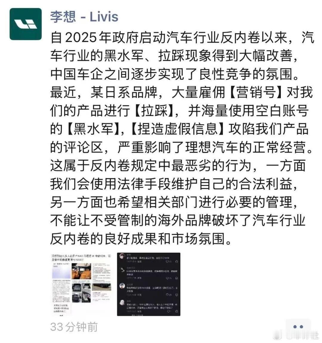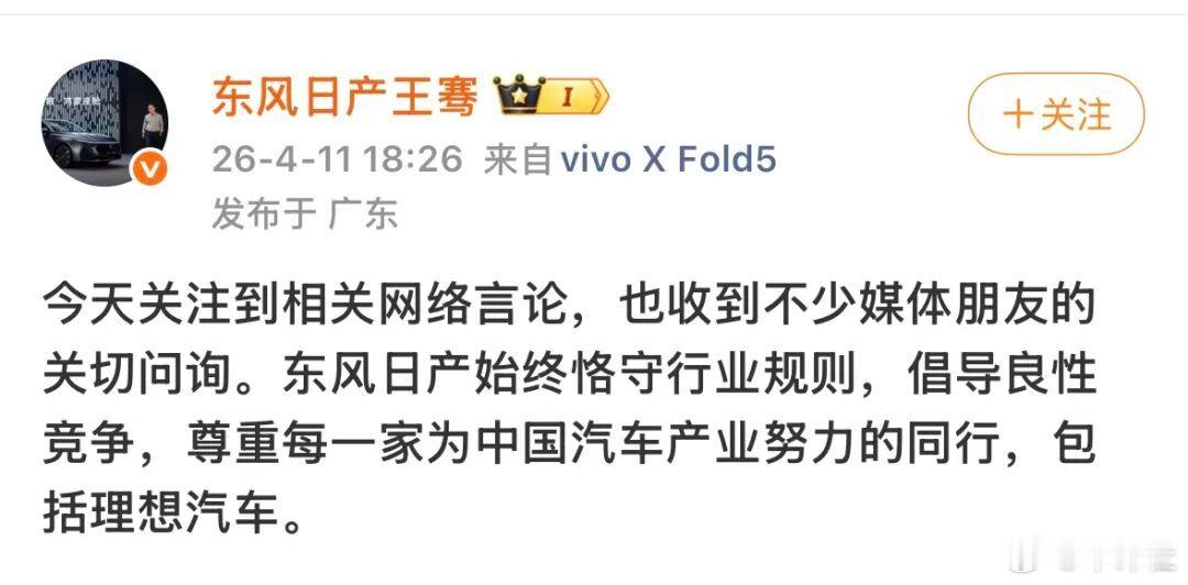 4月11日,东风日产汽车销售有限公司新能源品牌总经理王骞发文回应理想CEO李想在朋友圈炮轰一事。王骞表示:“今天关注到相关网络言论,也收到不少媒体朋友的关切问询。东风日产始终恪守行业规则,倡导良性竞争,尊重每一家为中国汽车产业努力的同行,包括理想汽车。”东风日产高管回应李想炮轰新能源汽车