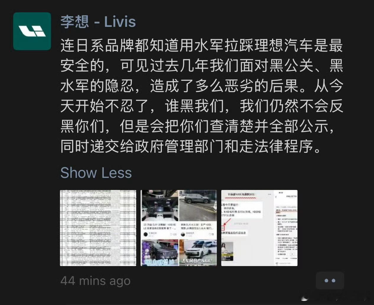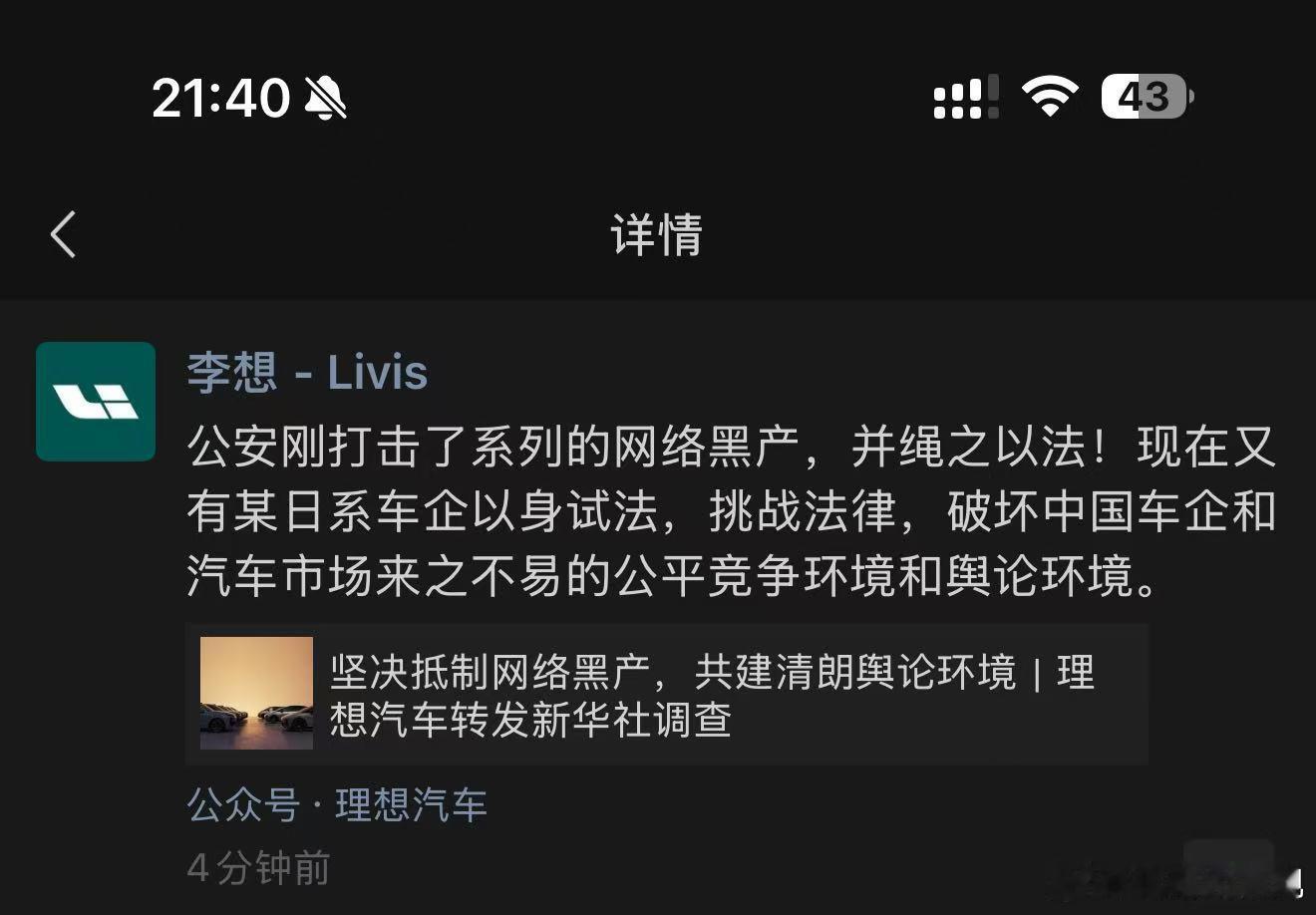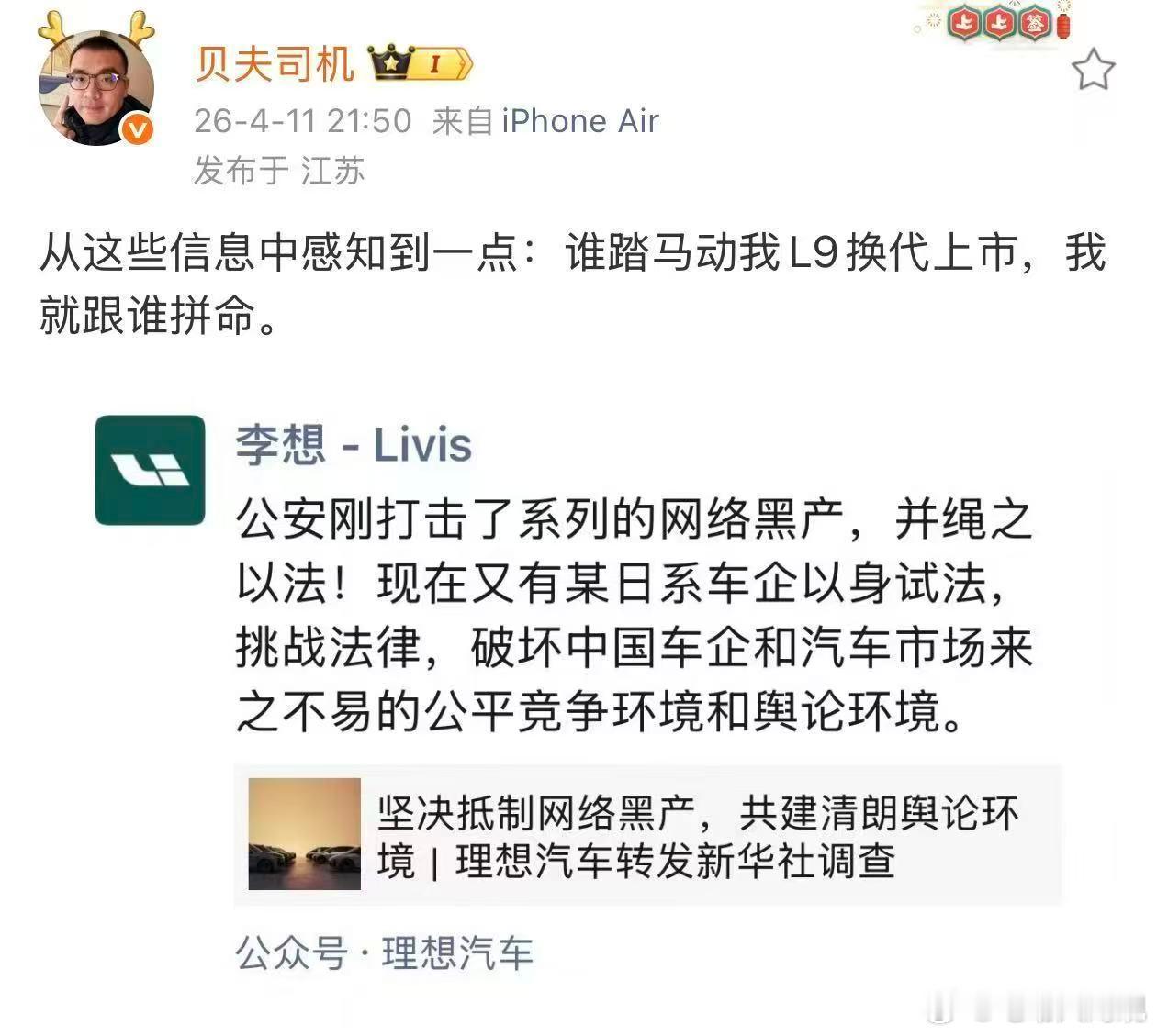 李想朋友圈彪脏话李想朋友圈再发文大局观观点 理想汽车就被拉踩对比报案