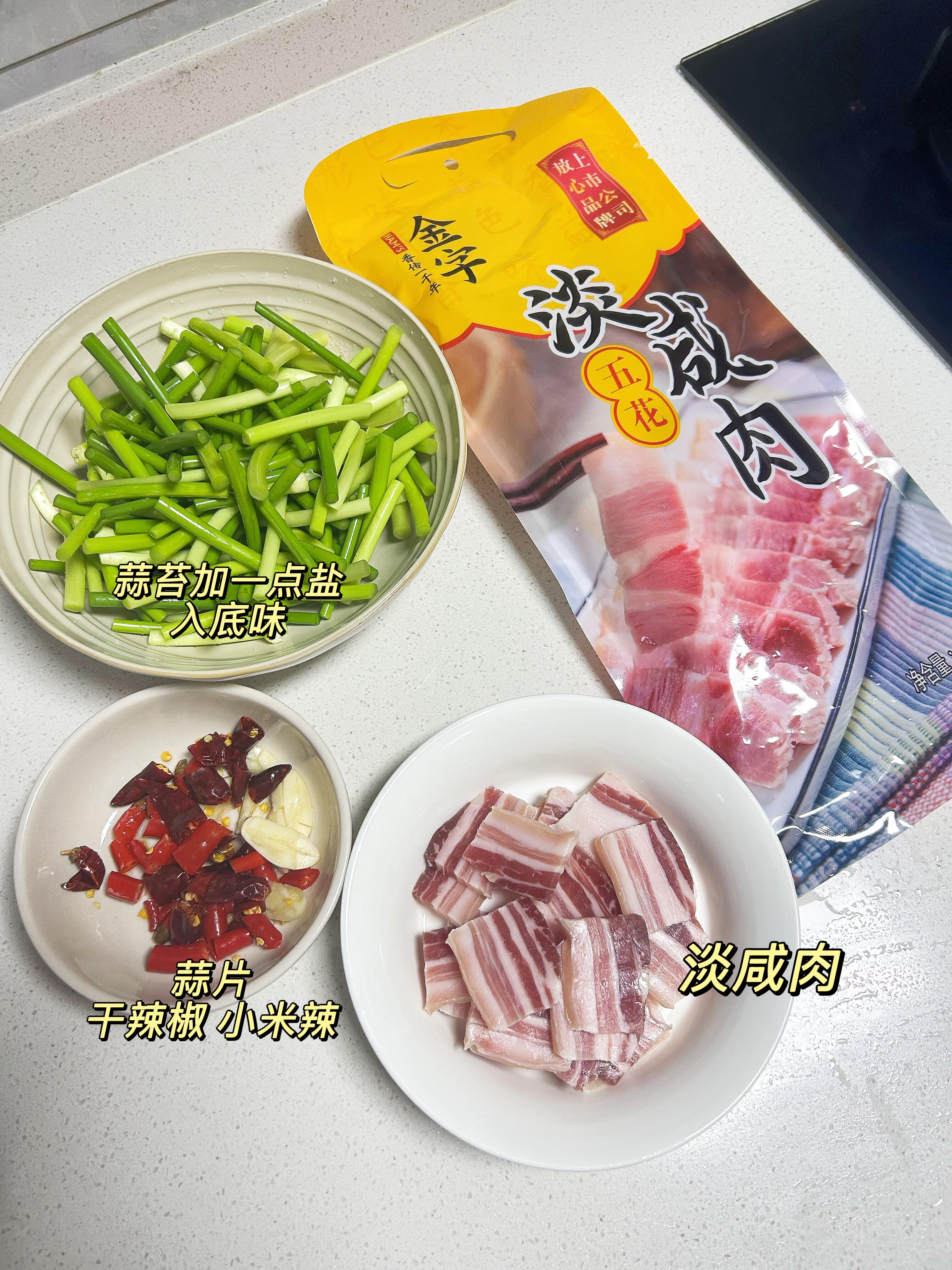 ✅ 准备食材:金字淡咸肉、新鲜蒜苔