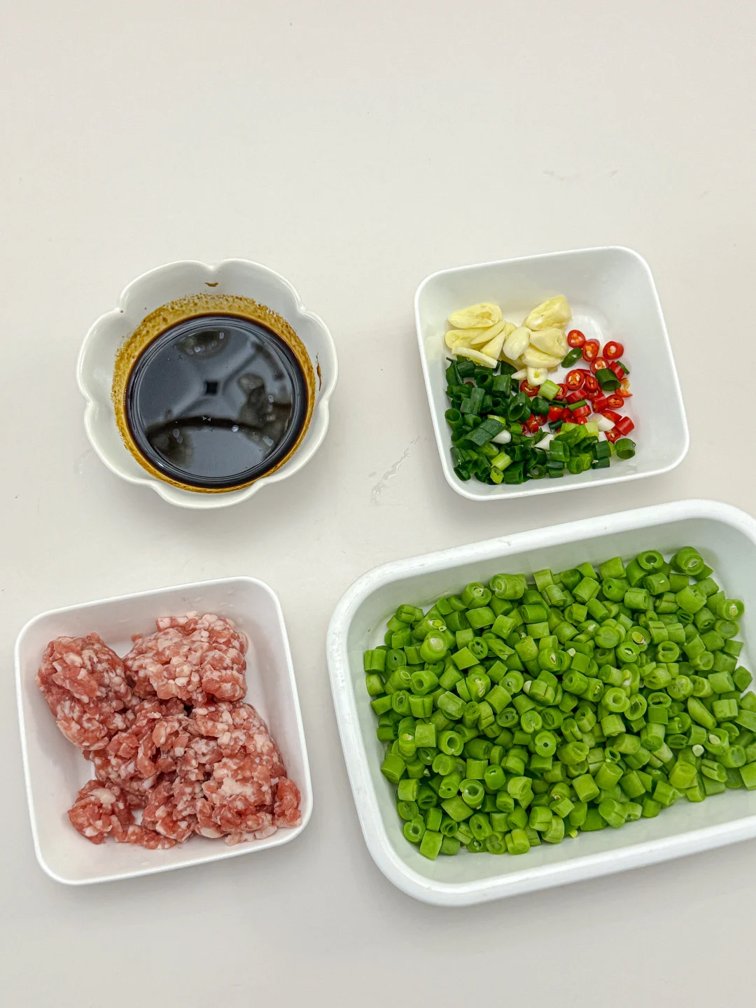 1️⃣ 豆角切丁煮熟,捞出备用