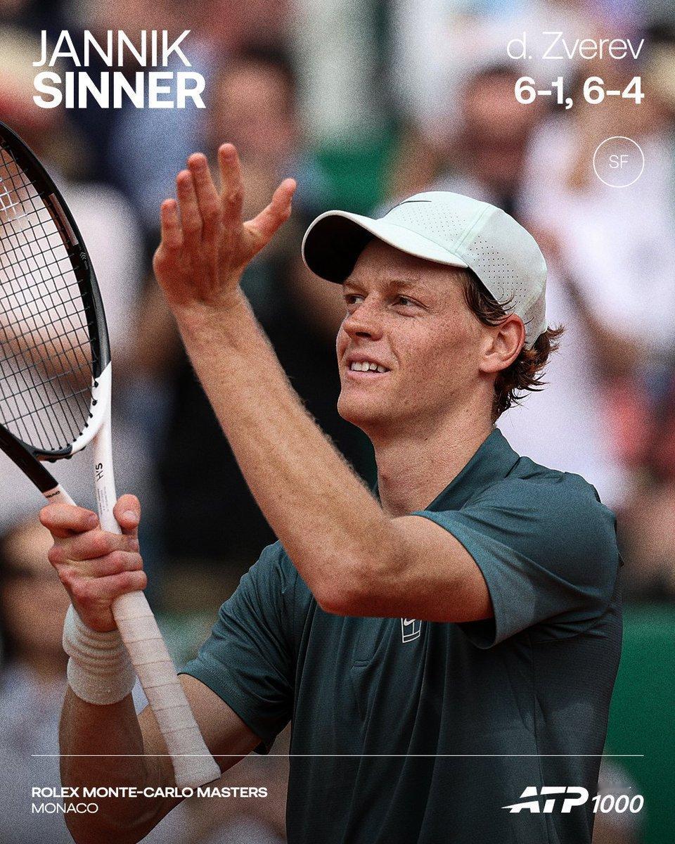 辛纳辛纳首进蒙特卡洛决赛辛纳八连胜兹维列夫 世界第二和世界第三的对决,最终6-1