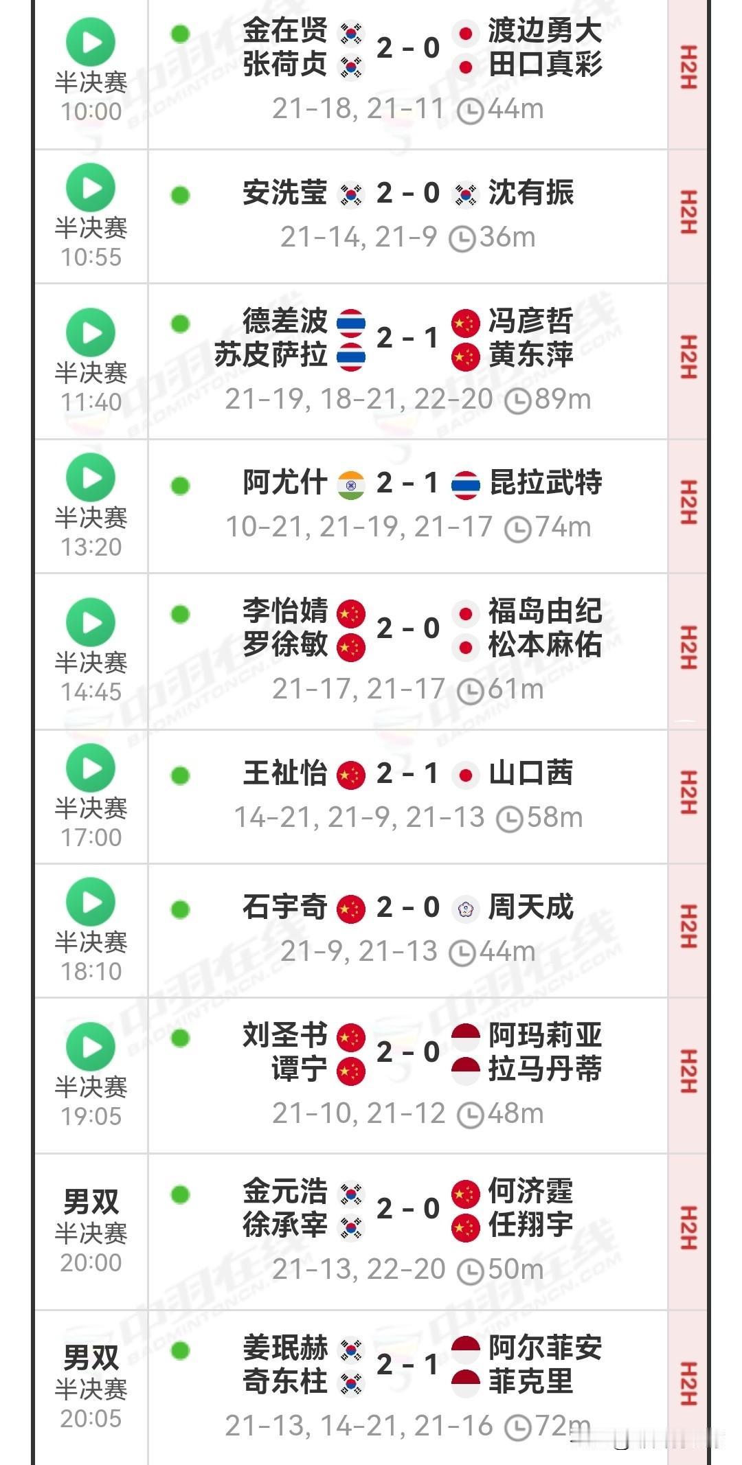 明日14:00将进行决赛,石宇奇对阵印度黑马阿尤什,王祉怡再战安洗莹。女双为国羽内战,男双是韩国内战。混双方面,德差波/苏皮萨拉因伤退出明日决赛,韩国组合白捡一枚金牌。