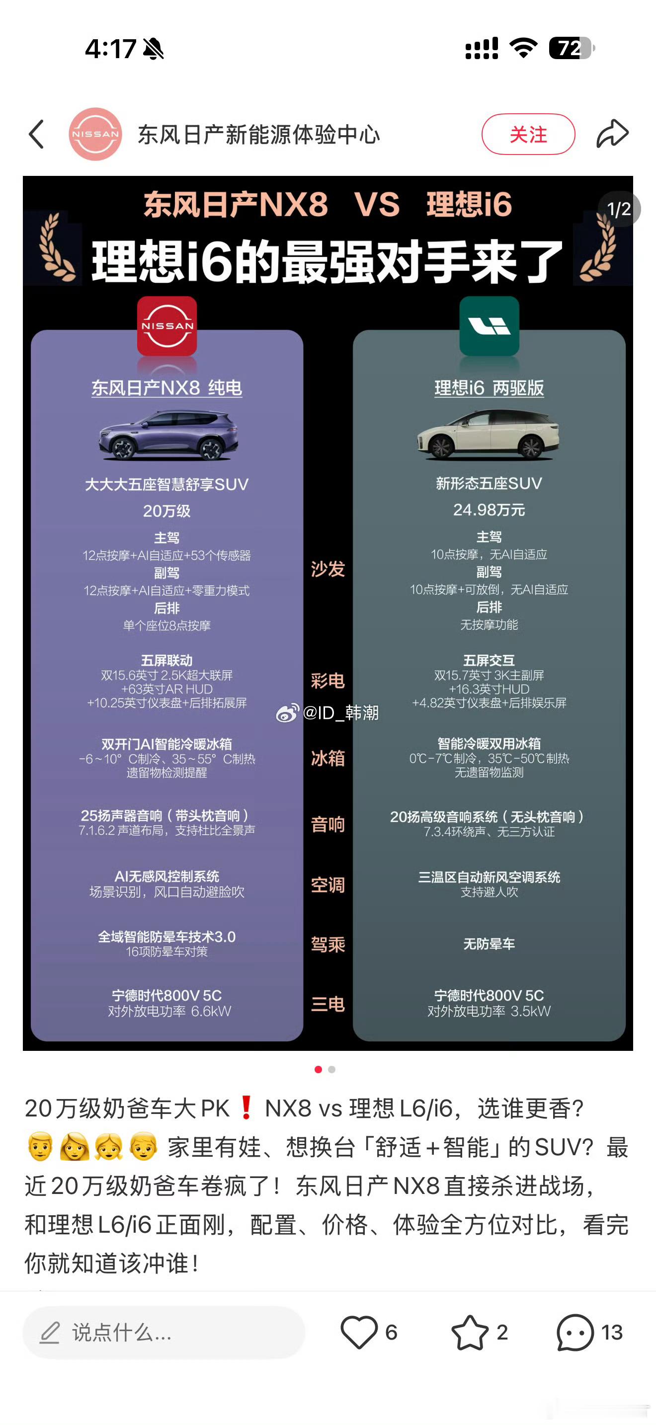 东风日产的公关也是神人,明明 NX8 就不可能吸引到理想 i6 的潜在客户,还非得硬蹭。单说图5的日产NX8对比理想i6,基本都不是 i6 客群看重的点,不能获客只能赢又是何意味呢。