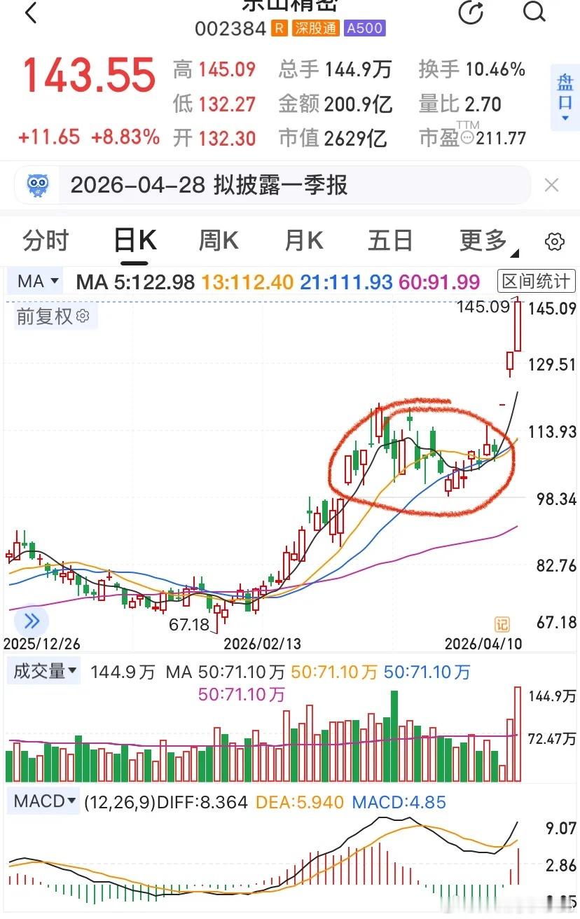东山精密这波行情是真的猛啊,先看数据:✅ 一季报业绩:2026年1-3月净利润10亿-11.5亿,同比暴增119.36%至152.27%,直接翻倍增长!✅ 年内涨幅:从年初低点80元附近,最高冲到143元,累计涨幅超73%,接近翻倍,妥妥的AI算力大白马!✅ 龙虎榜资金:4月8-10日三日榜,北向净买8.94亿,章盟主6.19亿,作手新一5.93亿,两家机构合计6.79亿,四大主力合力爆买近20亿,全市场顶级资金集体看好!