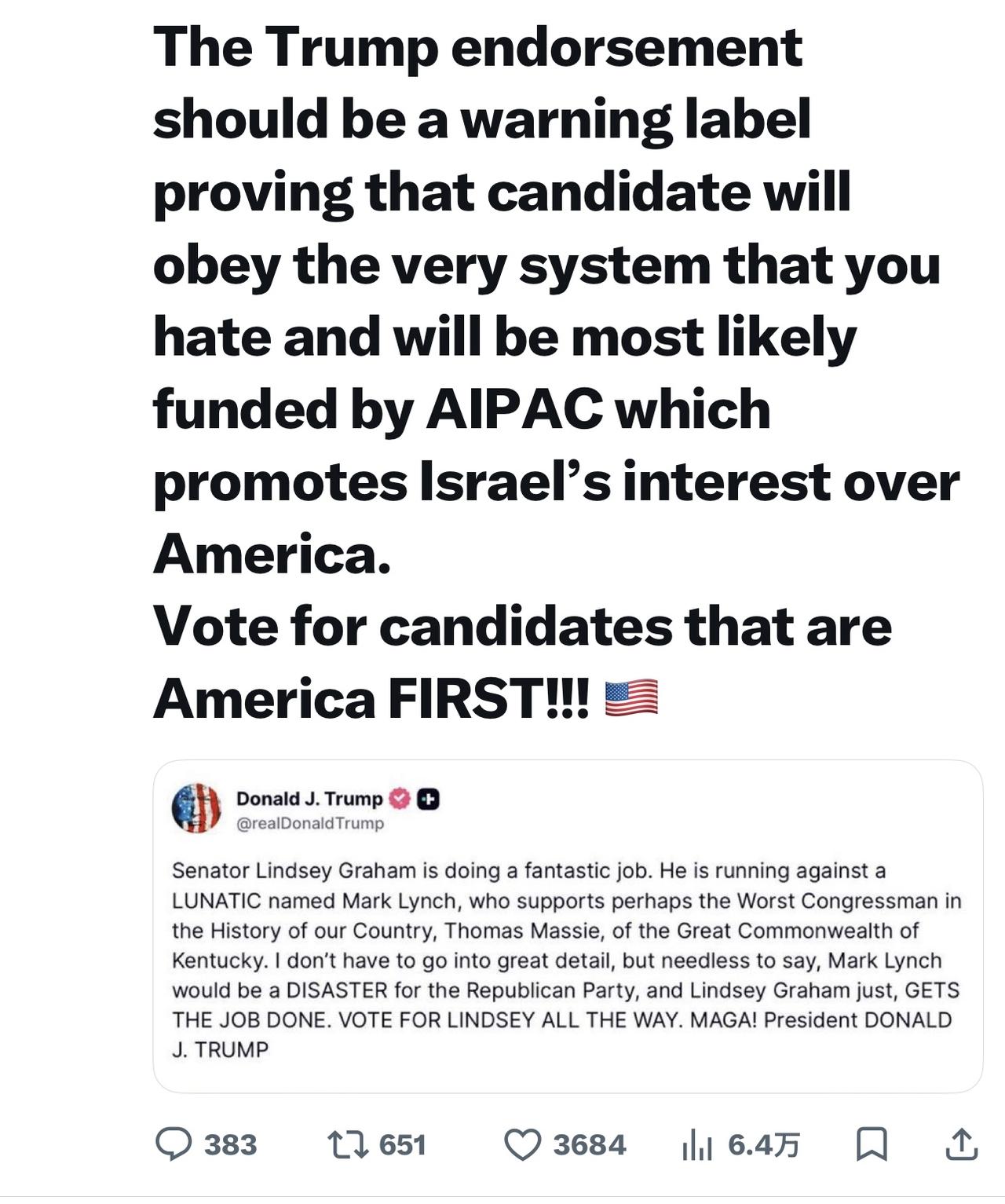 特朗普的背书应该是一个警告标签,证明那个候选人会服从你最恨的那个体系,而且很可能由AIPAC资助,该组织将以色列的利益置于美国之上。