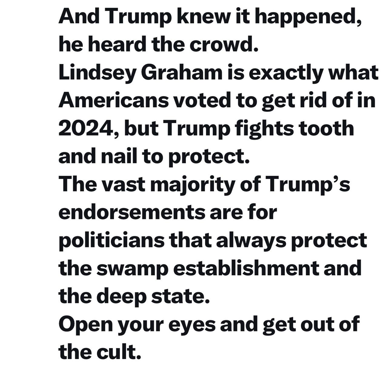 此前,特朗普发帖呼吁川粉支持林赛.格雷厄姆:林赛•格雷厄姆参议员的表现非常出色。他正在与一个名叫马克.林奇的精神病患者竞争。此人可能支持我们国家历史上最糟糕的国会议员—来自伟大的肯塔基州联邦的托马斯•马斯利。我无需详细阐述,但毫无疑问,马克•林奇对共和党来说将是一场灾难。而林赛•格雷厄姆则能胜任这份工作。请一路投票支持林赛。MAGA!