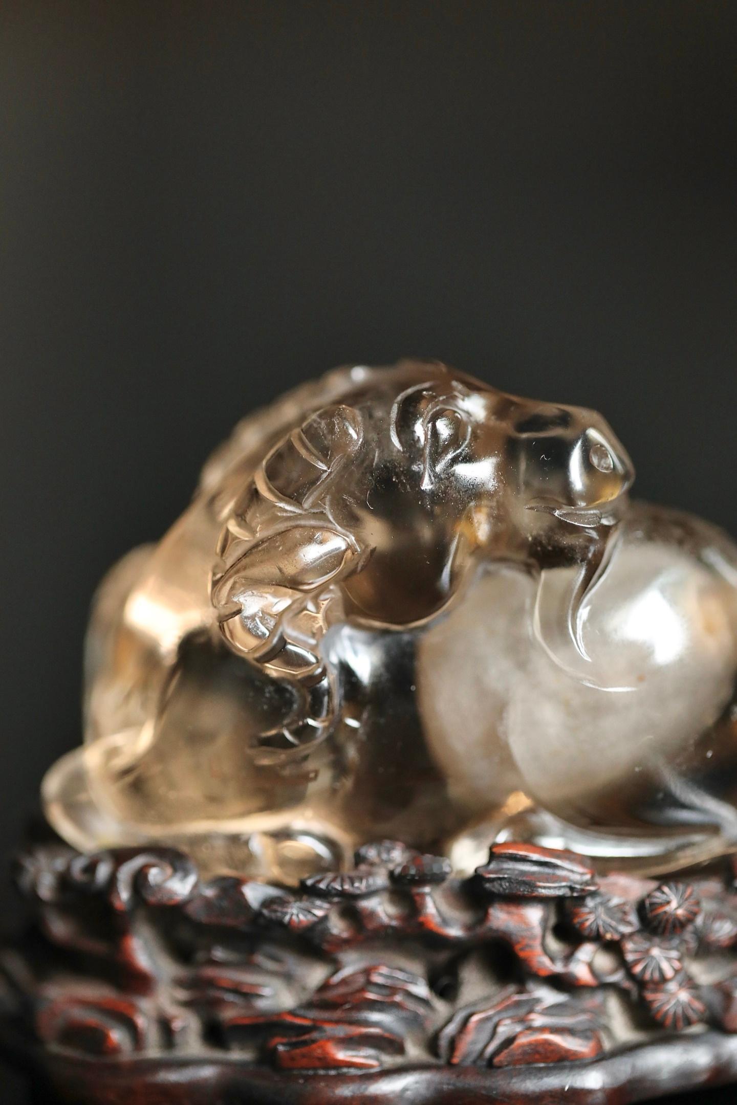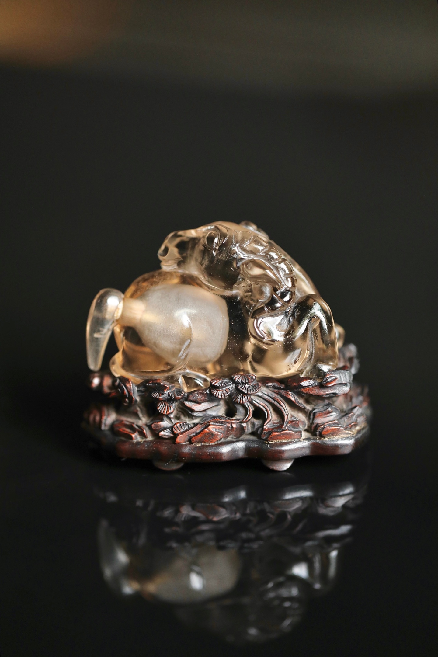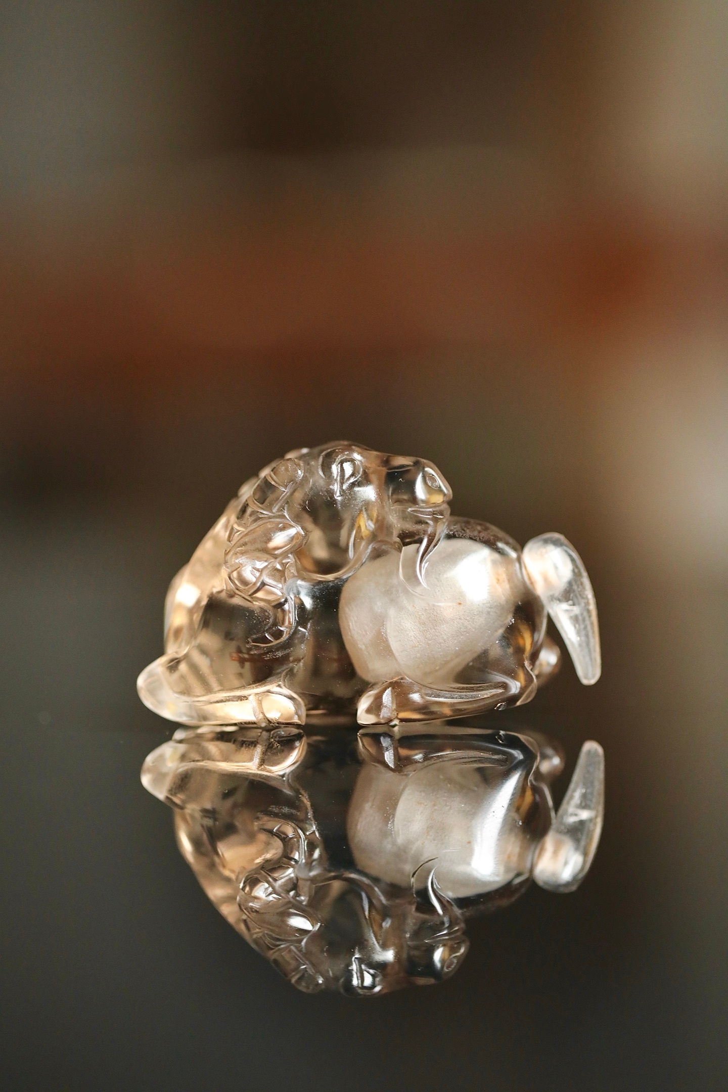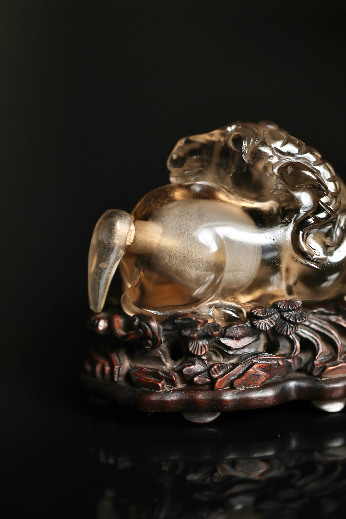 体取瑞羊之形,呈卧憩之态,线条流畅圆转,体态憨态可掬,暗合“三羊开泰”之吉兆。工匠于方寸之间巧施圆雕技法,将羊之温顺灵动刻画入微;尾部开孔精准,密封性佳,既是实用盛器,亦是掌上珍玩。茶晶古称“烟晶”,自古为文人藏家青睐的沉稳之石,此壶融材质之美、工艺之精与寓意之雅于一体,是案头供奉与雅集赏玩的不二之选。