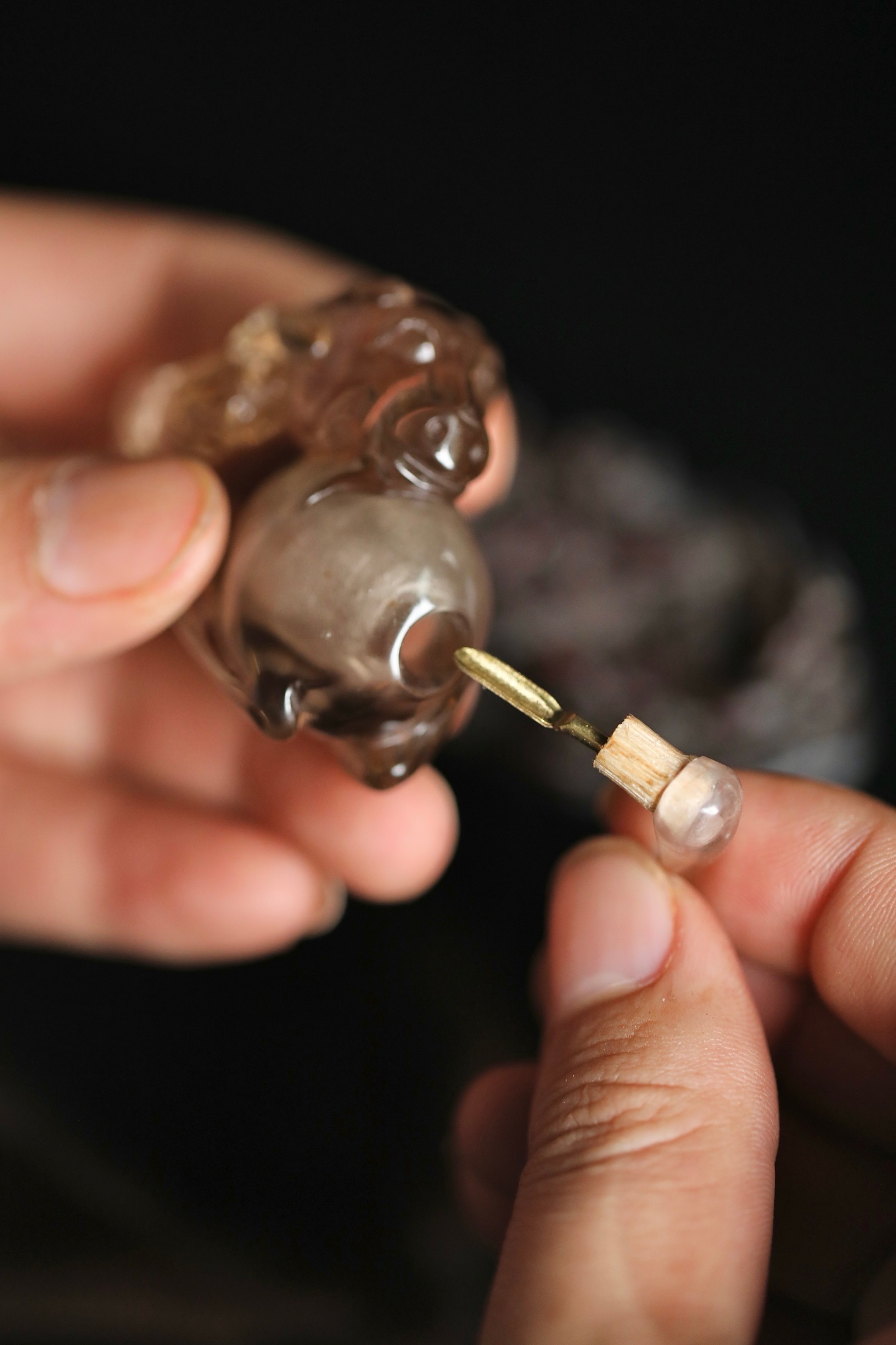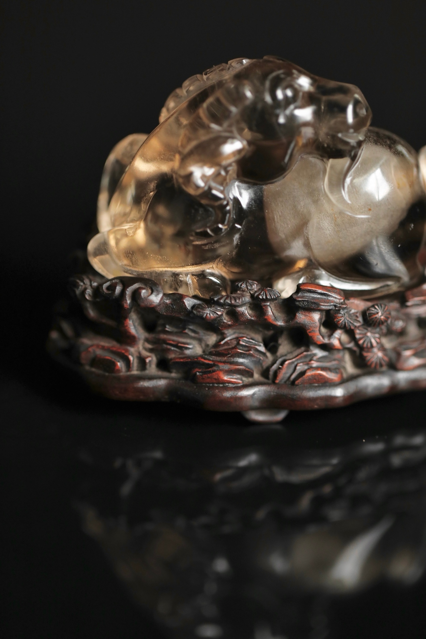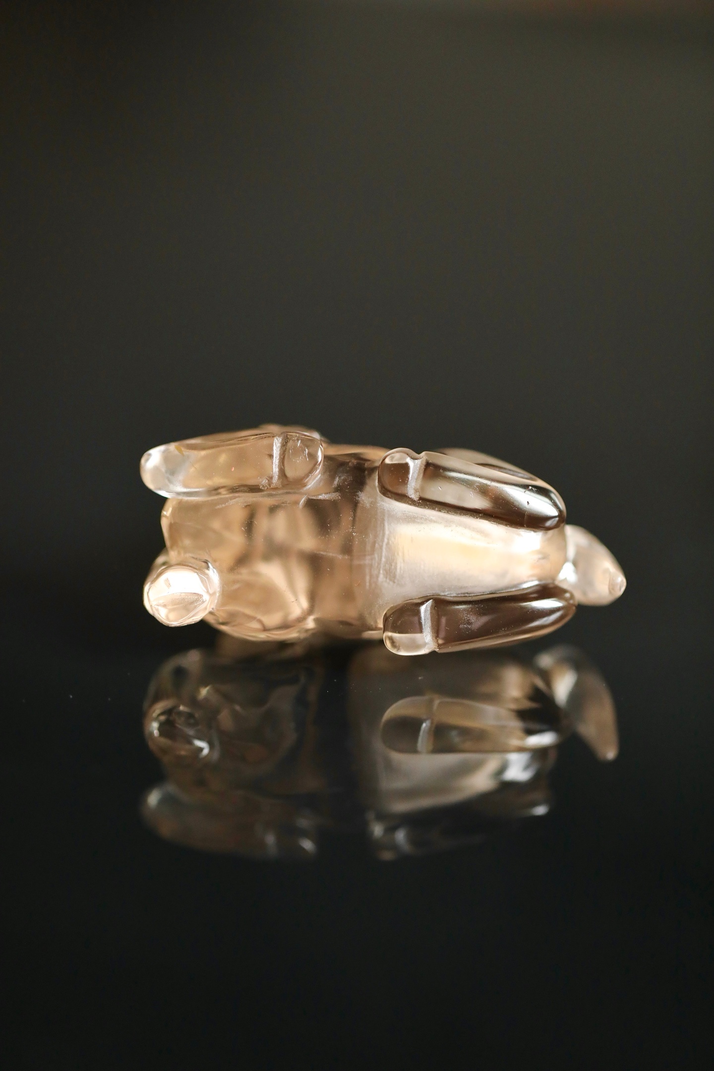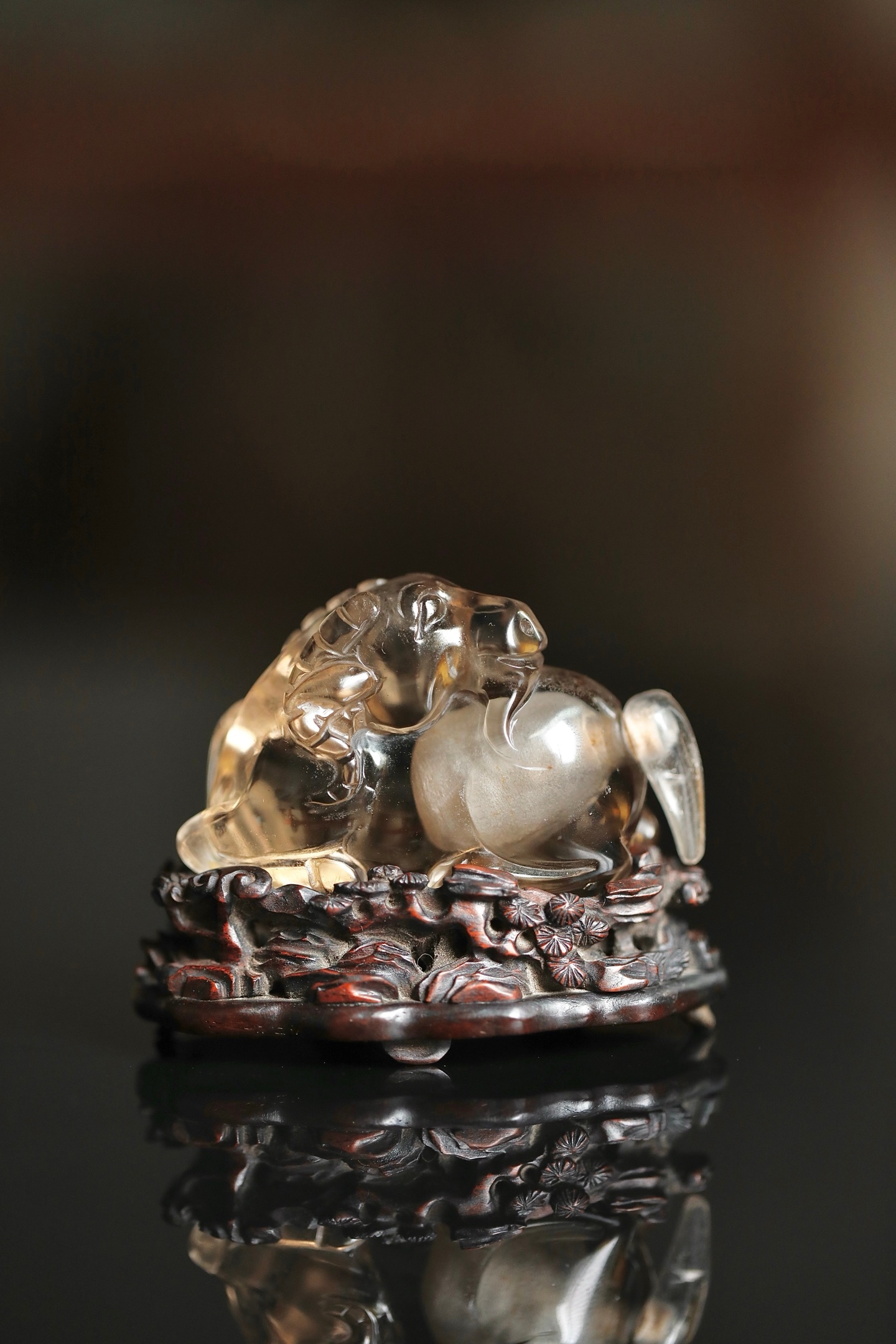 体取瑞羊之形,呈卧憩之态,线条流畅圆转,体态憨态可掬,暗合“三羊开泰”之吉兆。工匠于方寸之间巧施圆雕技法,将羊之温顺灵动刻画入微;尾部开孔精准,密封性佳,既是实用盛器,亦是掌上珍玩。茶晶古称“烟晶”,自古为文人藏家青睐的沉稳之石,此壶融材质之美、工艺之精与寓意之雅于一体,是案头供奉与雅集赏玩的不二之选。