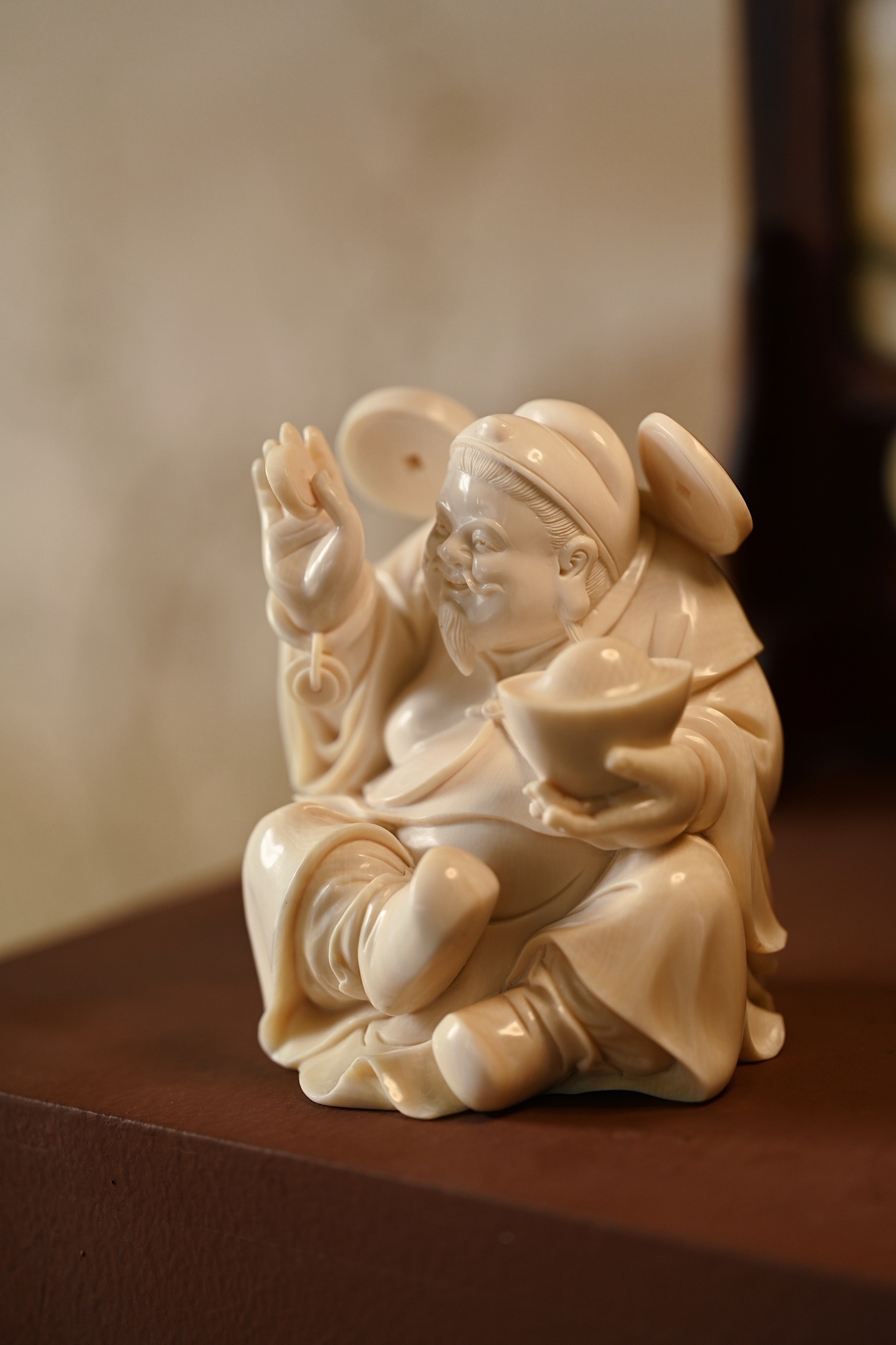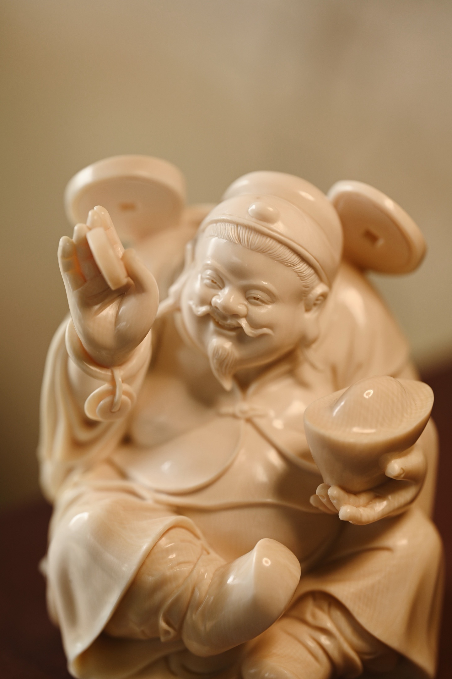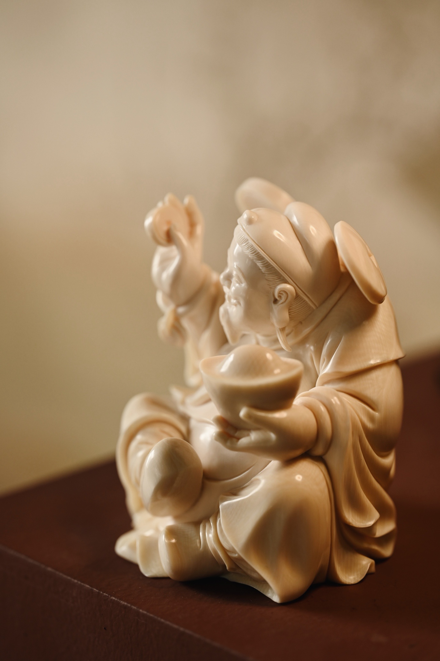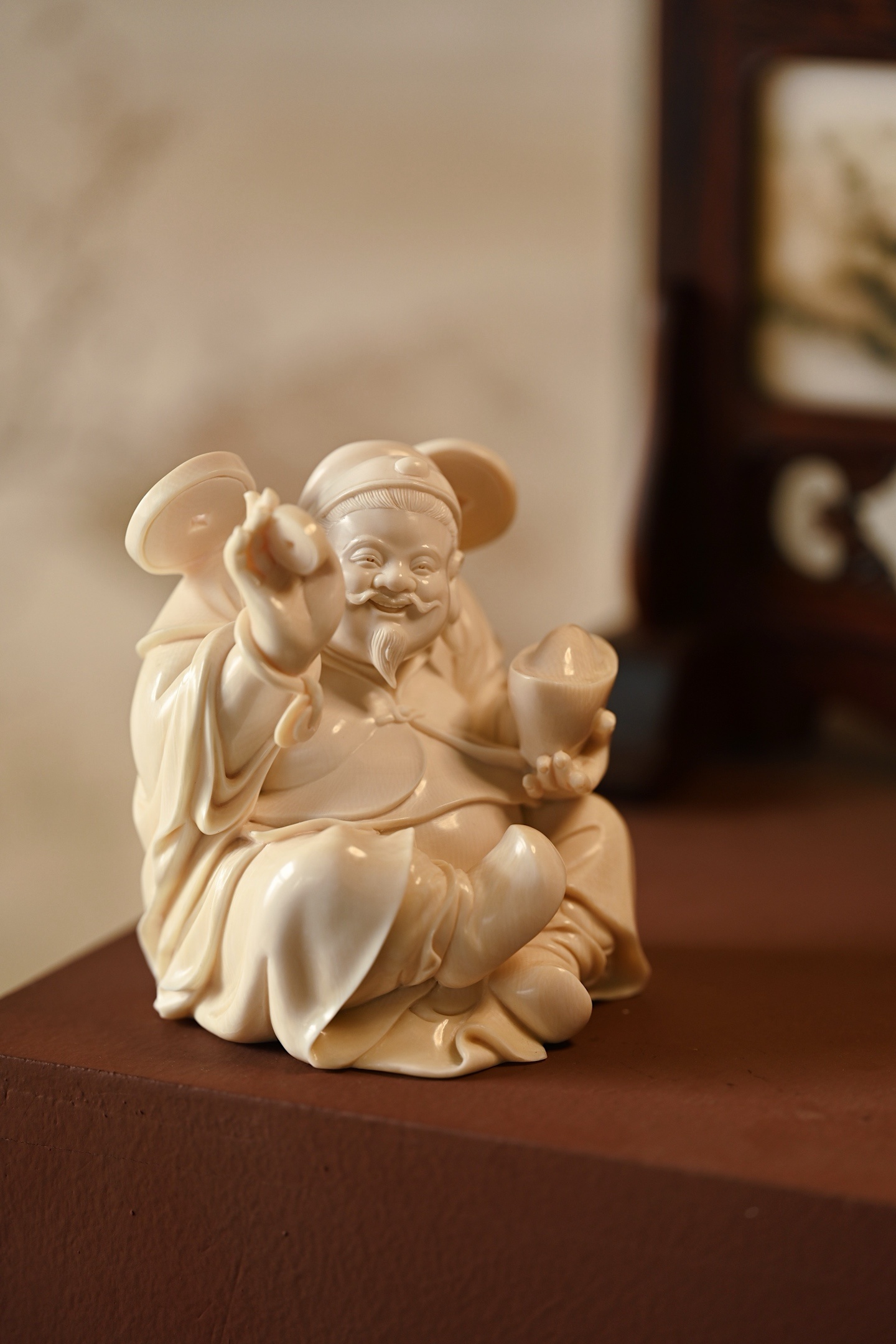 择选好料,雕刻财神爷神态和蔼,笑意盈盈,尽显福瑞之气;衣袍宽松,体态丰腴,尽显富贵之相。左手金元宝寓意“招财纳福”,右手铜钱象征“财源滚滚”,是案头陈设、招财纳福之佳选。