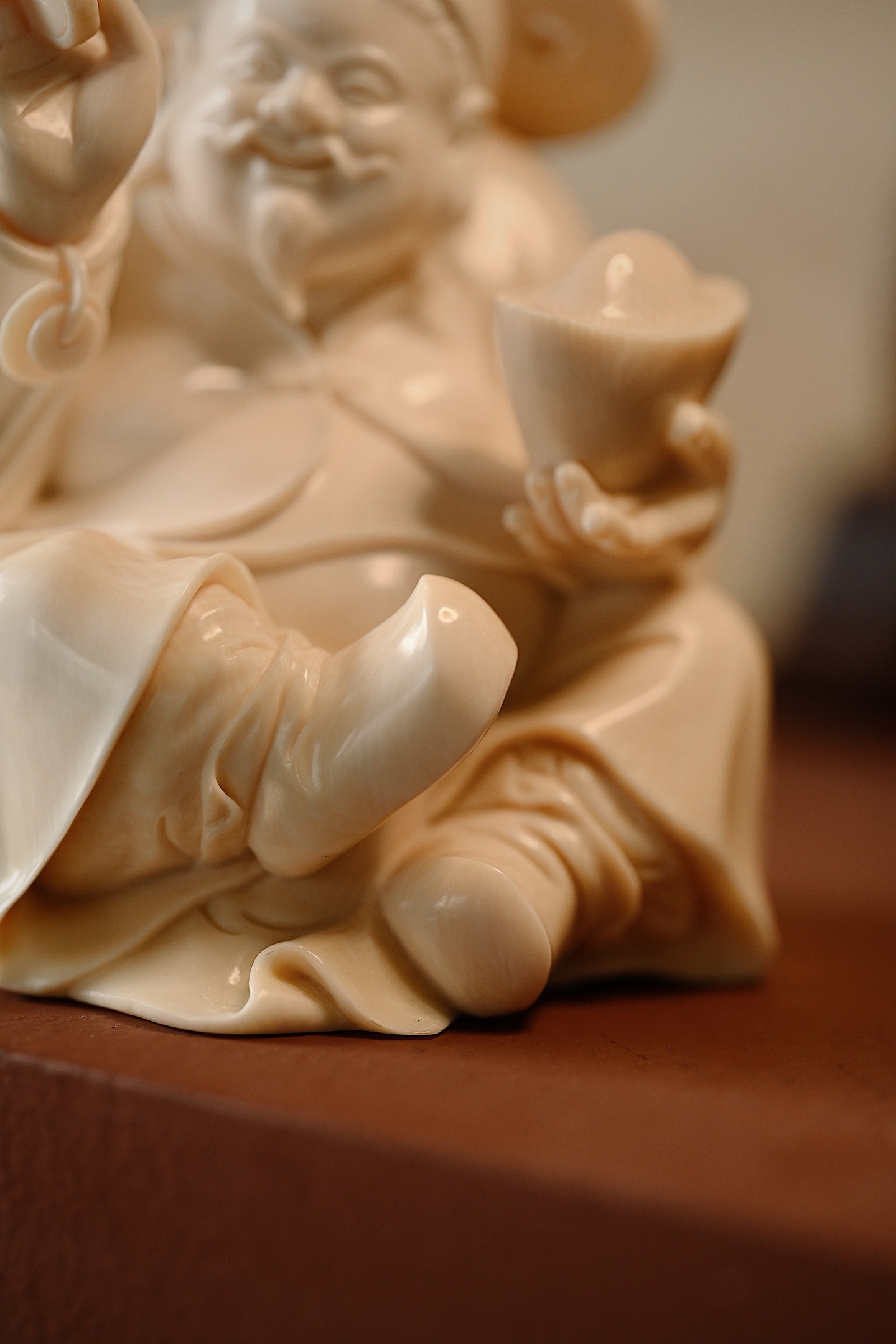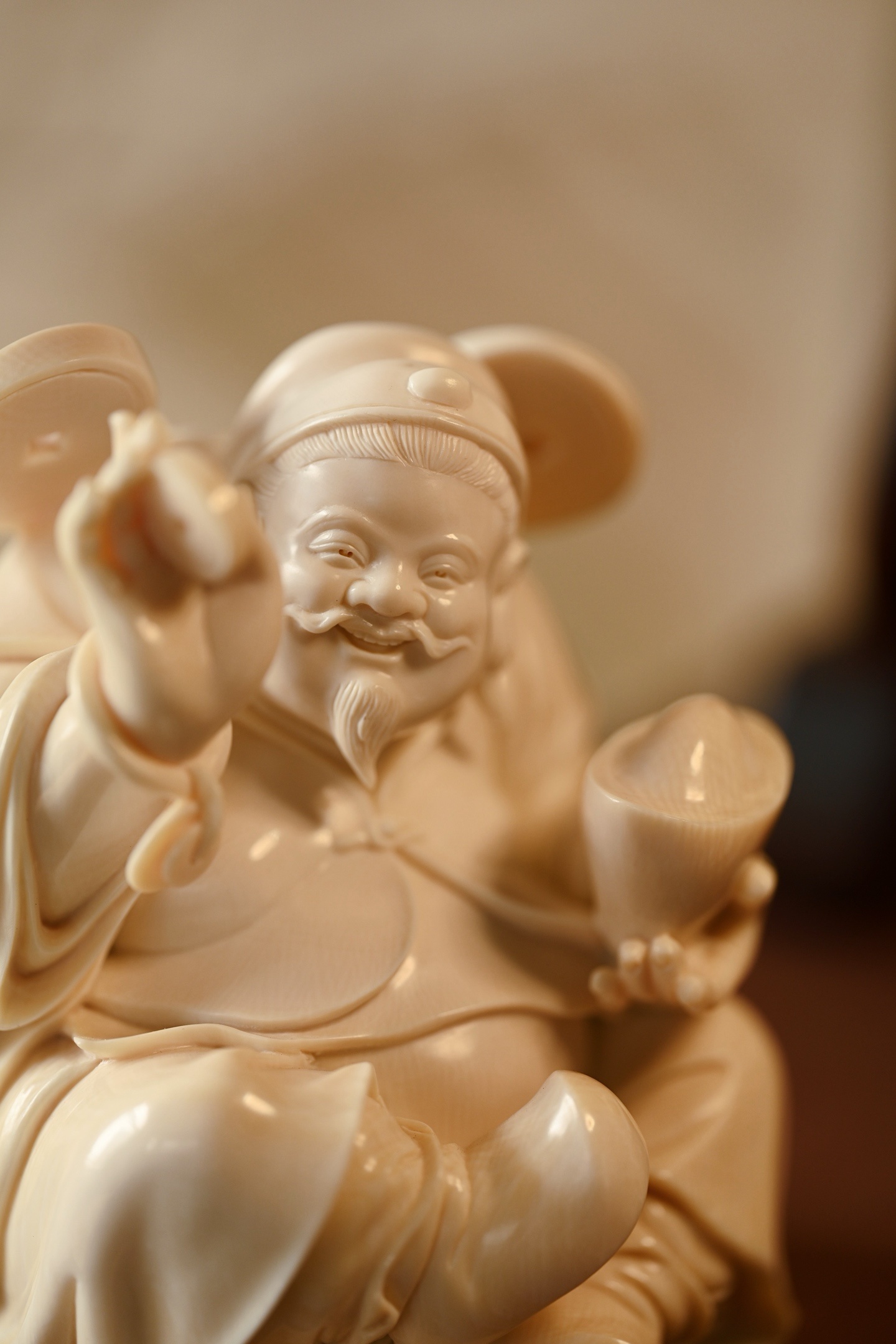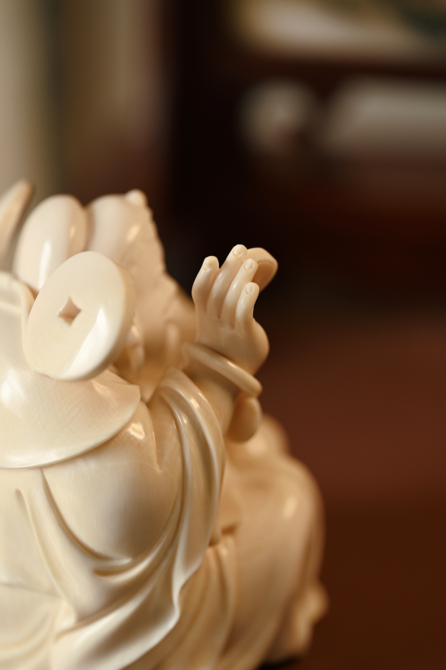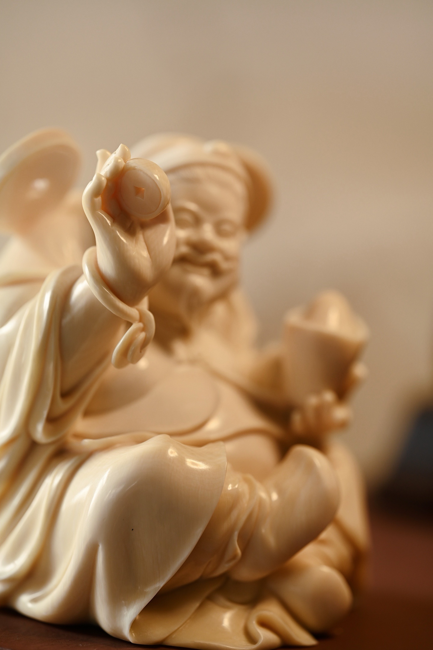 择选好料,雕刻财神爷神态和蔼,笑意盈盈,尽显福瑞之气;衣袍宽松,体态丰腴,尽显富贵之相。左手金元宝寓意“招财纳福”,右手铜钱象征“财源滚滚”,是案头陈设、招财纳福之佳选。