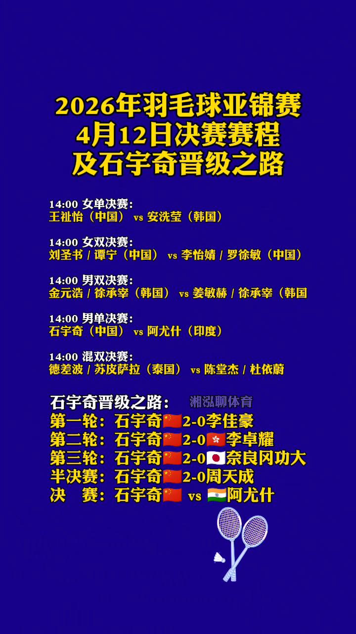 2026年羽毛球亚锦赛4月12日决赛赛程及石宇奇晋级之路。