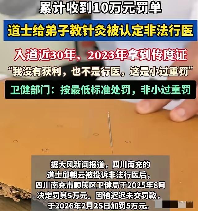四川南充,一位61岁的老道爷,因为教徒弟针灸,被人举报非法行医,罚了5万。老头气不过,外出云游去了,结果罚款没交,又给加了5万,变成十万了!他这才急了眼,赶紧去申请复议,说罚得太重。