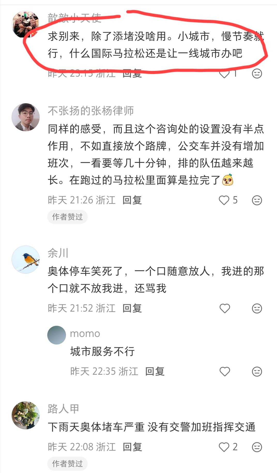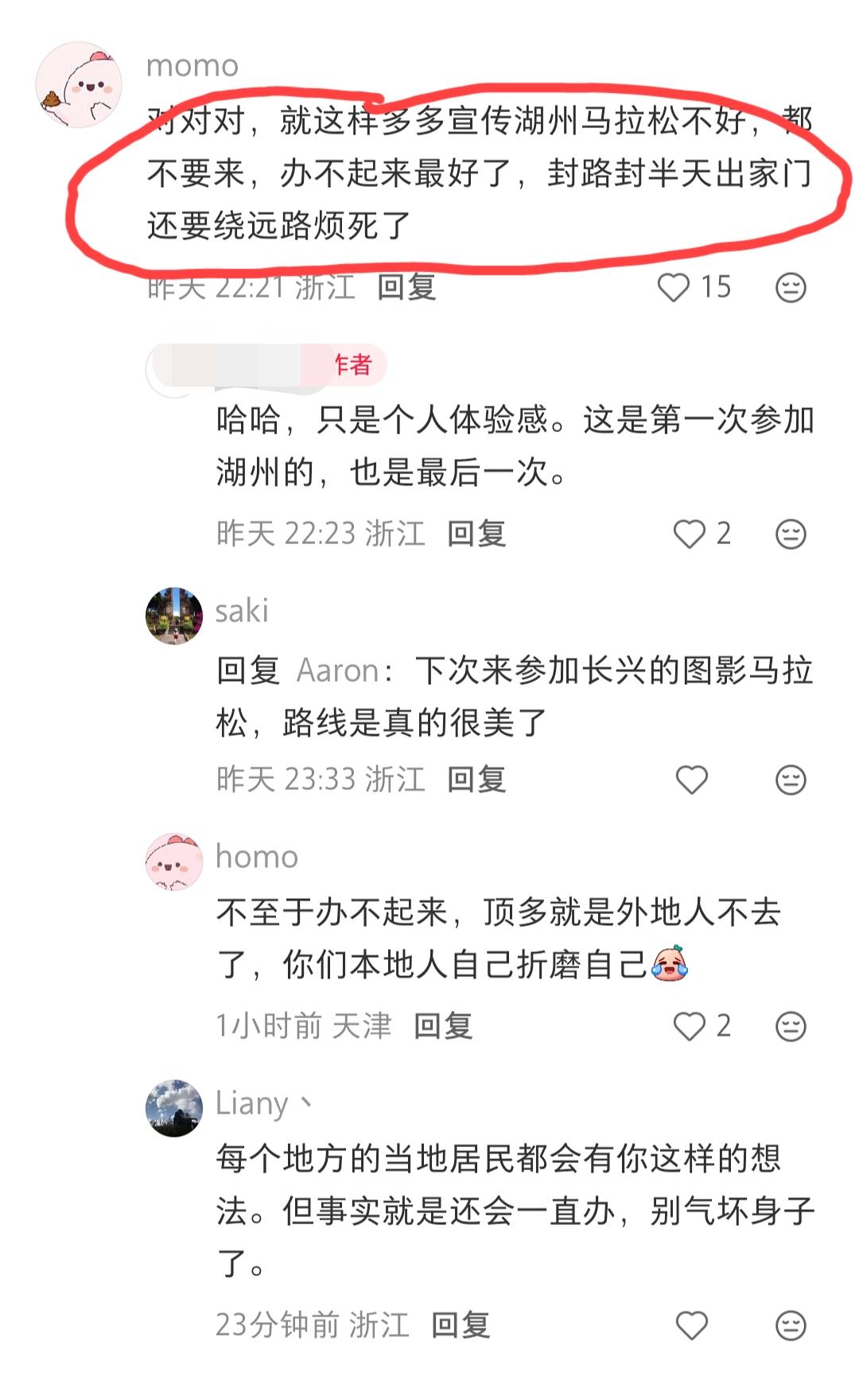 可对于这样的吐槽,湖州本地网友并不表示反感,纷纷举起双手表示欢迎:“对对对,就这样多多宣传湖州马拉松,都不要来,办不起来最好了,封路封半天出家门还要绕远路烦死了”。