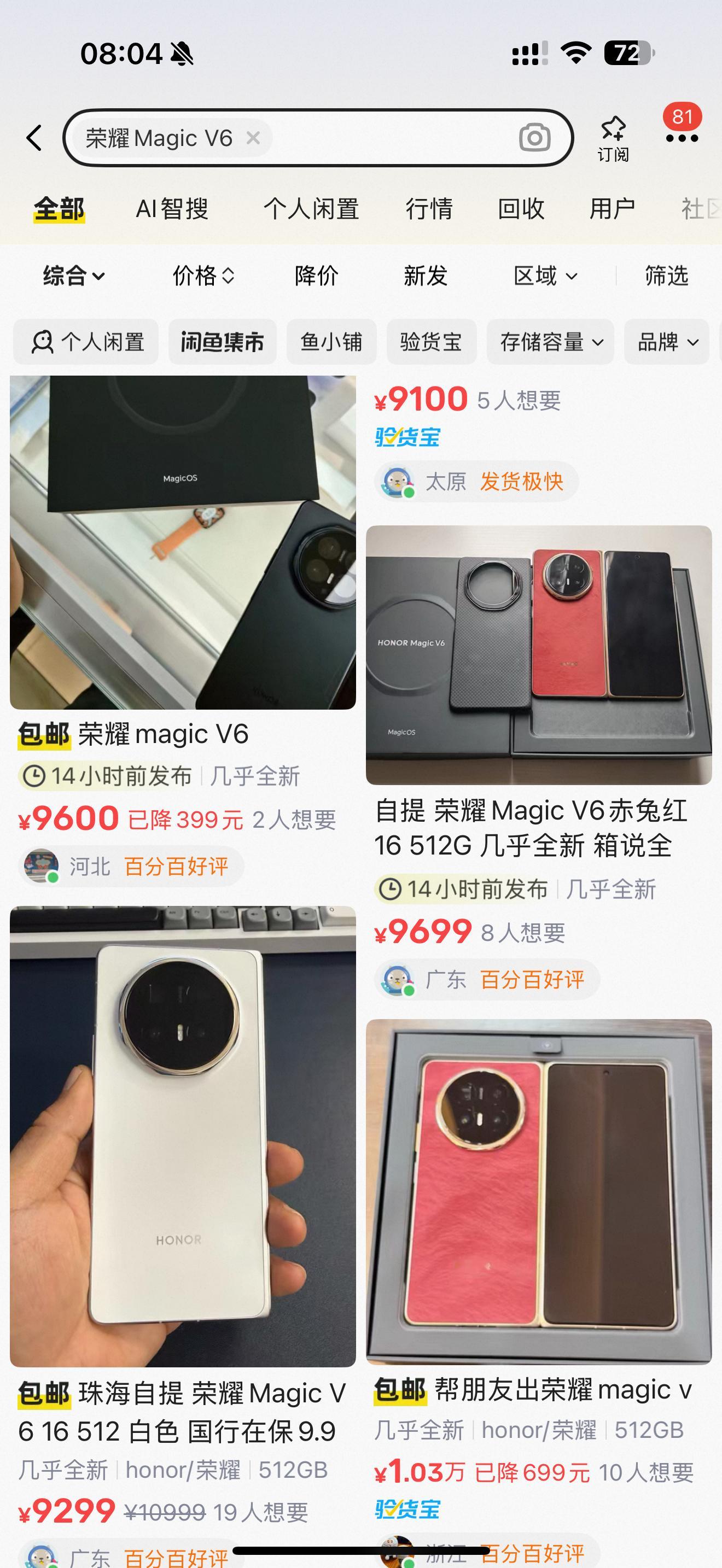荣耀Magic V6赤兔红这个颜色真的火,看了一下新的基本都没货,二手平台上面赤